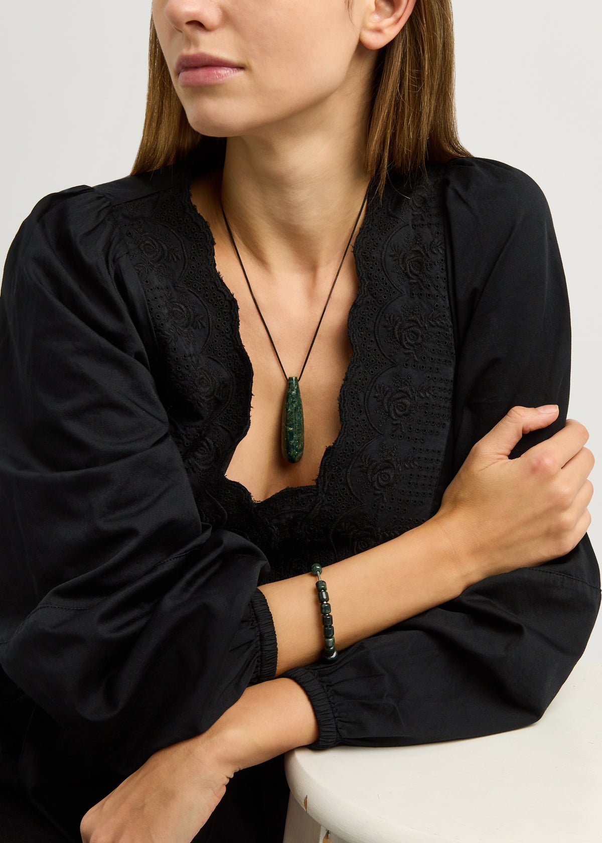 Handmade with a jade pendant and silver-plated hardware. Features an adjustable tie fastening; cord length: 80 cm, pendant dimensions: 1.5 cm x 6 cm. Presented in a designer-stamped pouch, exclusive to Harvey Nichols.