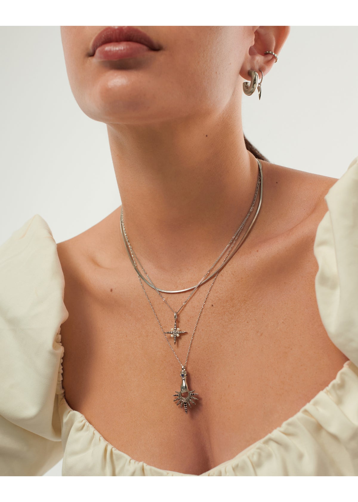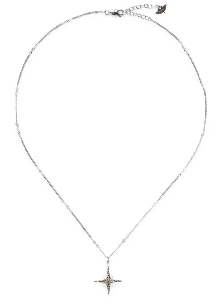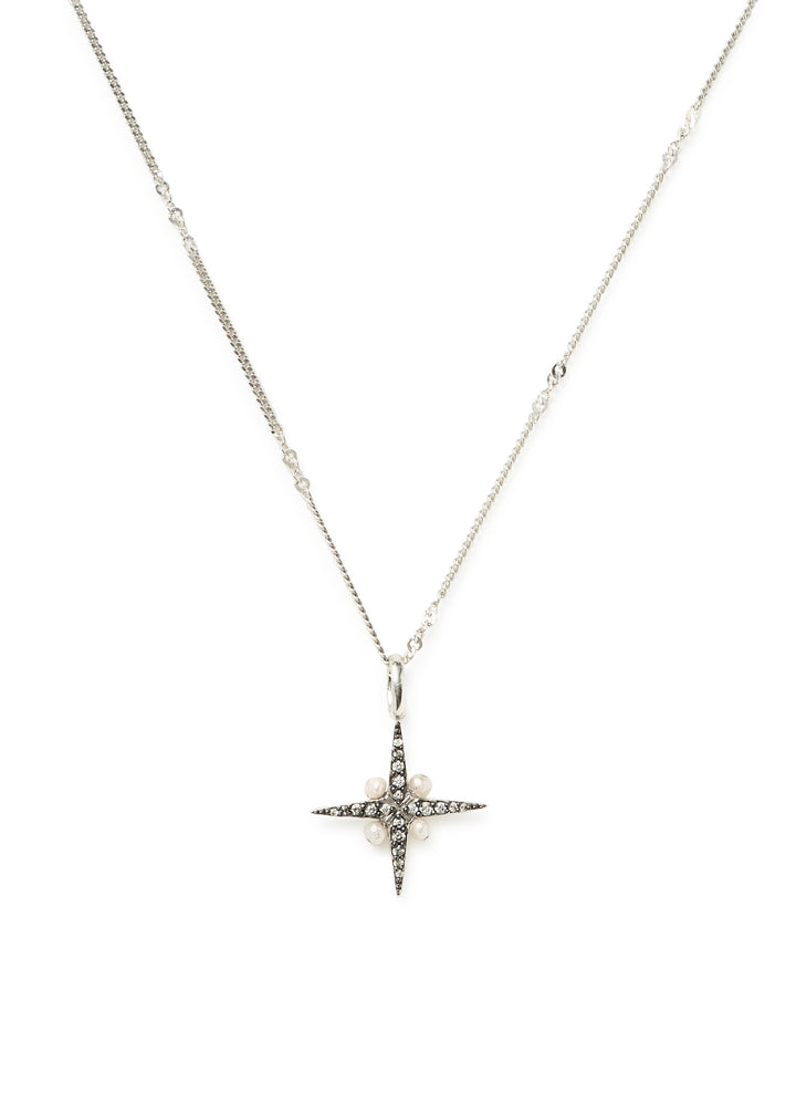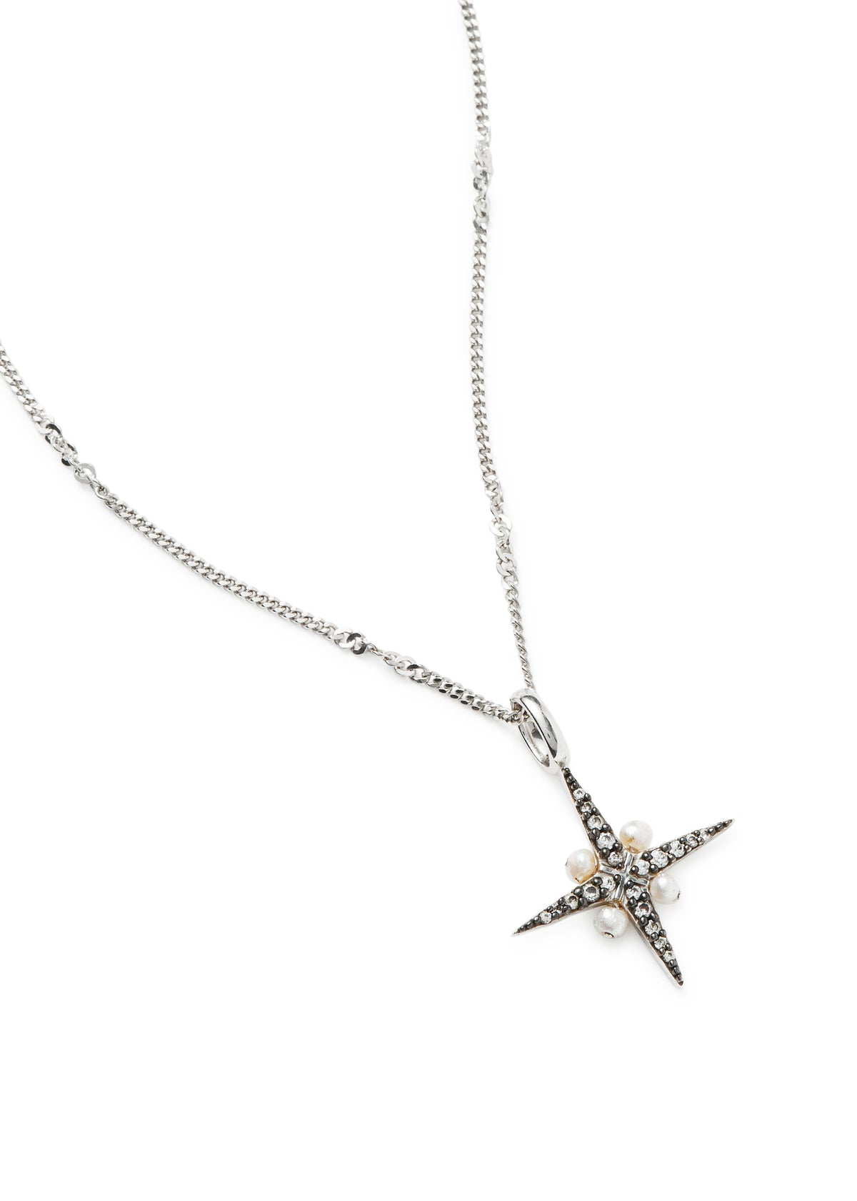 Hand-finished with rhodium-plated recycled sterling silver, featuring a North Star pendant with a pearl cabochon and pavé crystals. Adjustable lobster-clasp fastening. Length: 41 cm to 45 cm.