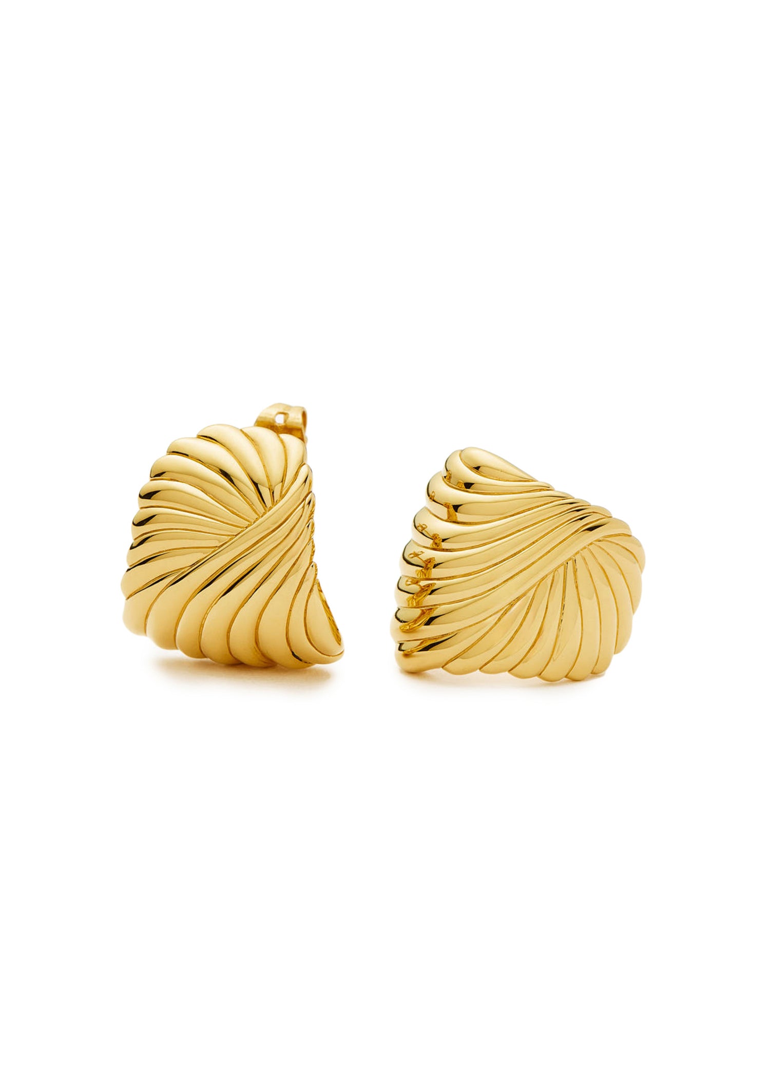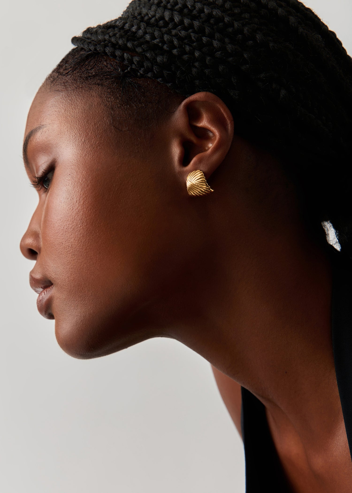 Made from 18kt gold-plated metal with a textured ripple design. Butterfly fastening for pierced ears. Dimensions: 1.7 cm x 1.6 cm. Please note, we are unable to refund or exchange pierced earrings.