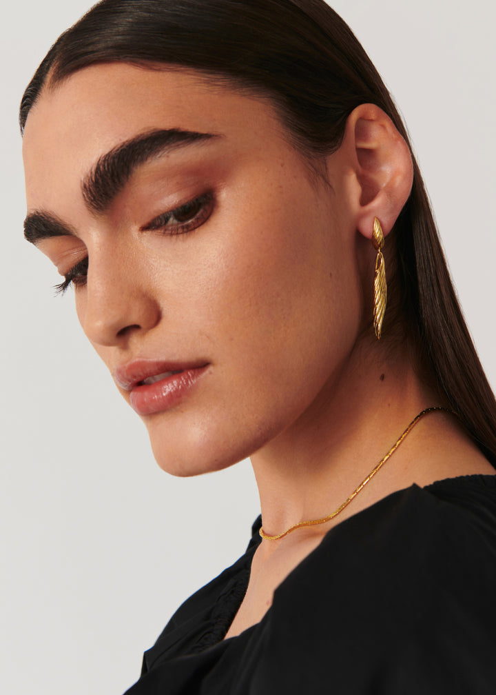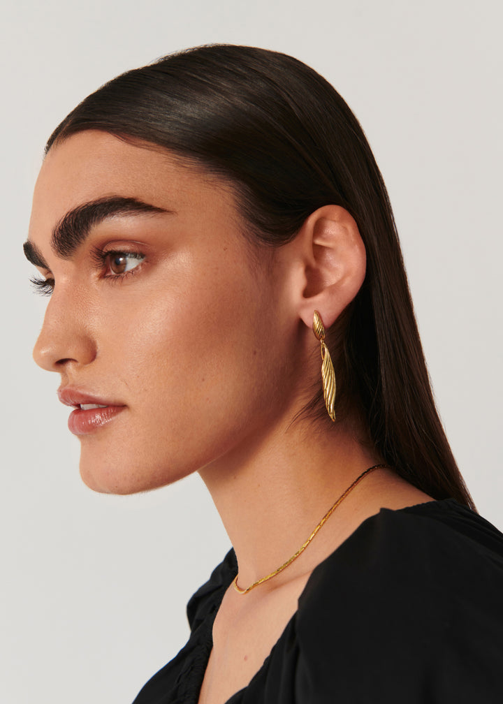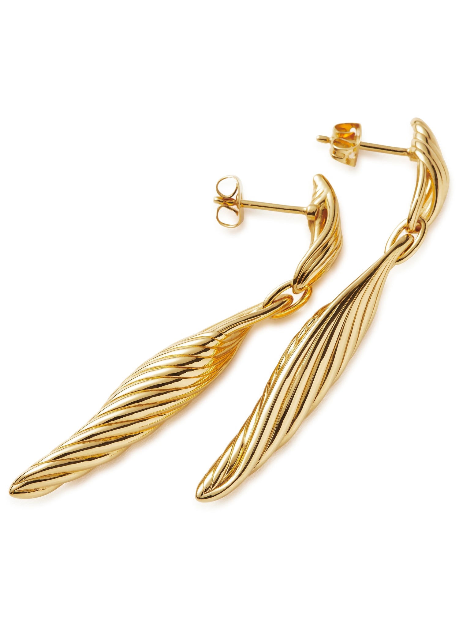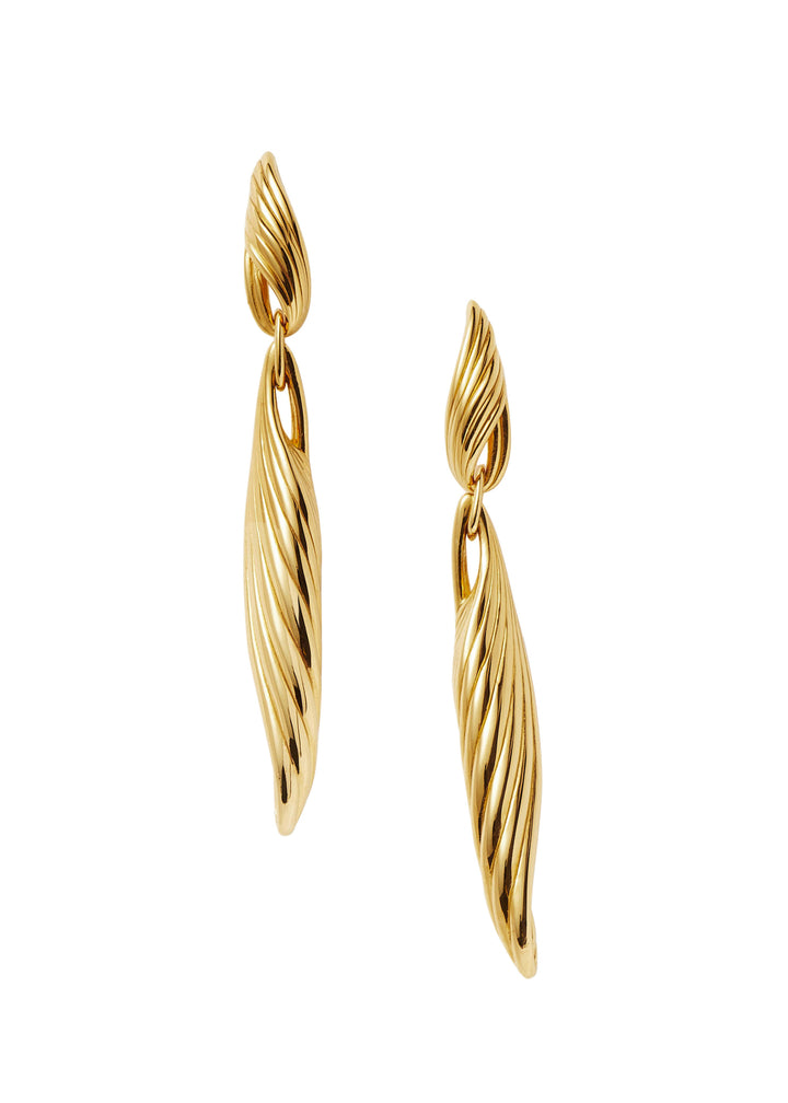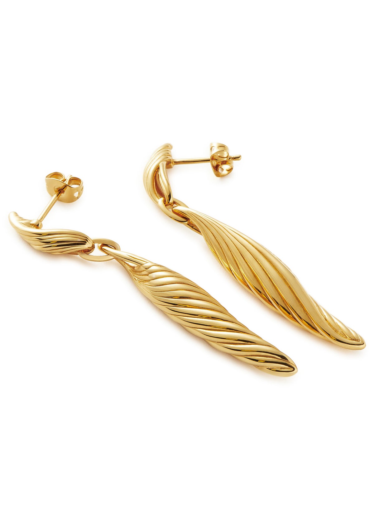 Made from recycled 18kt gold-plated metal with a twisted, ridged design and tapered pendant. Butterfly fastening for pierced ears. Length: 5.6 cm. Please note, we are unable to refund or exchange pierced earrings.
