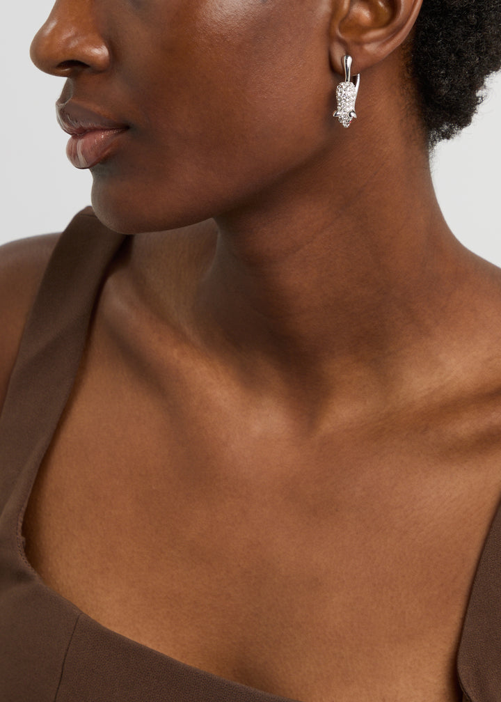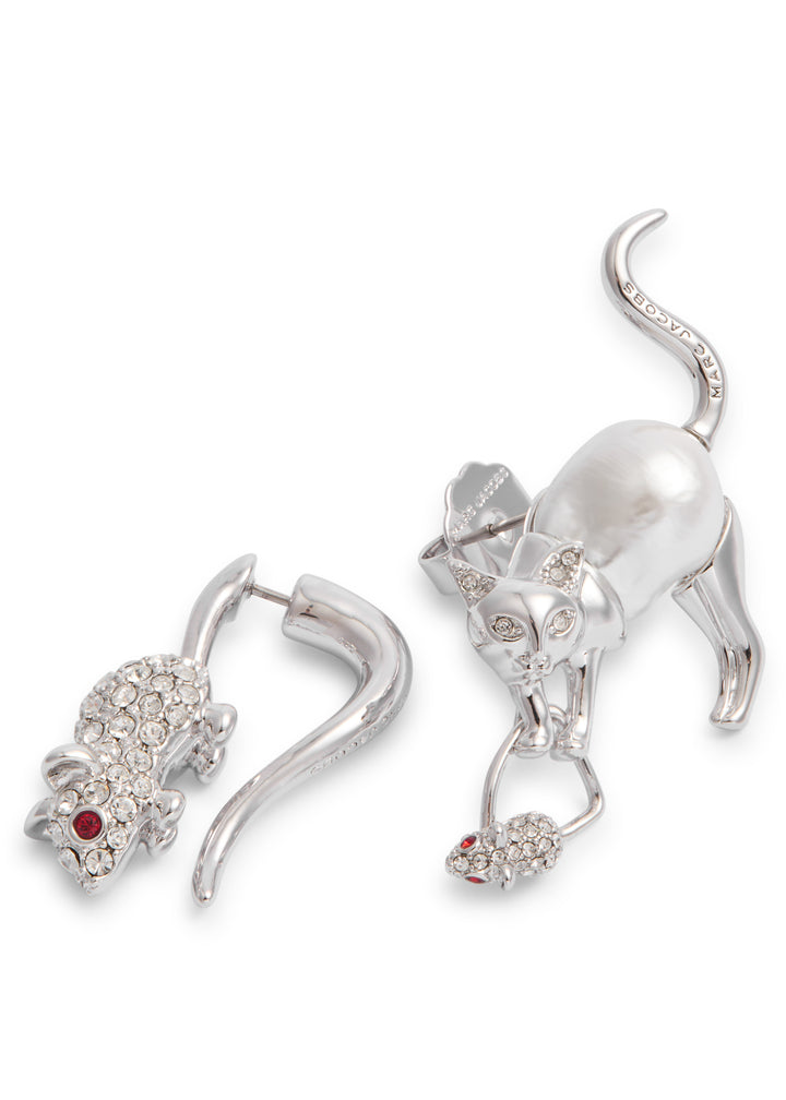 This Cat And Mouse mismatched earring set by Marc Jacobs reflects the designer's bold, whimsical aesthetic, combining high fashion with playful charm. The first earring features a glass baroque pearl cat with crystal embellishments and a mouse charm drop, while the second earring showcases a crystal-adorned mouse design. Ideal for trendsetters, this set encapsulates Marc Jacobs’ signature blend of sophistication and humor.