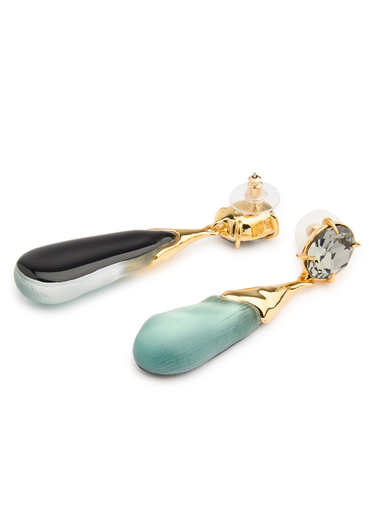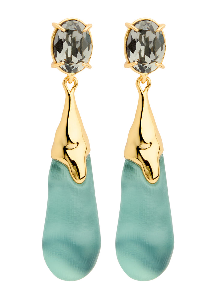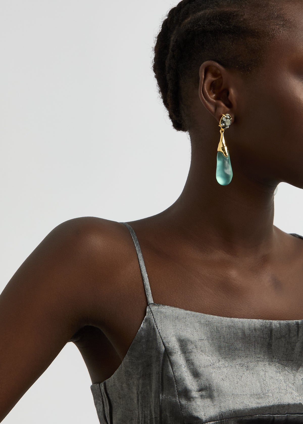 Hand-finished in 14kt gold-plated brass with crystal embellishments and Lucite detailing, post fastening for pierced ears. Drop: 5.5 cm.