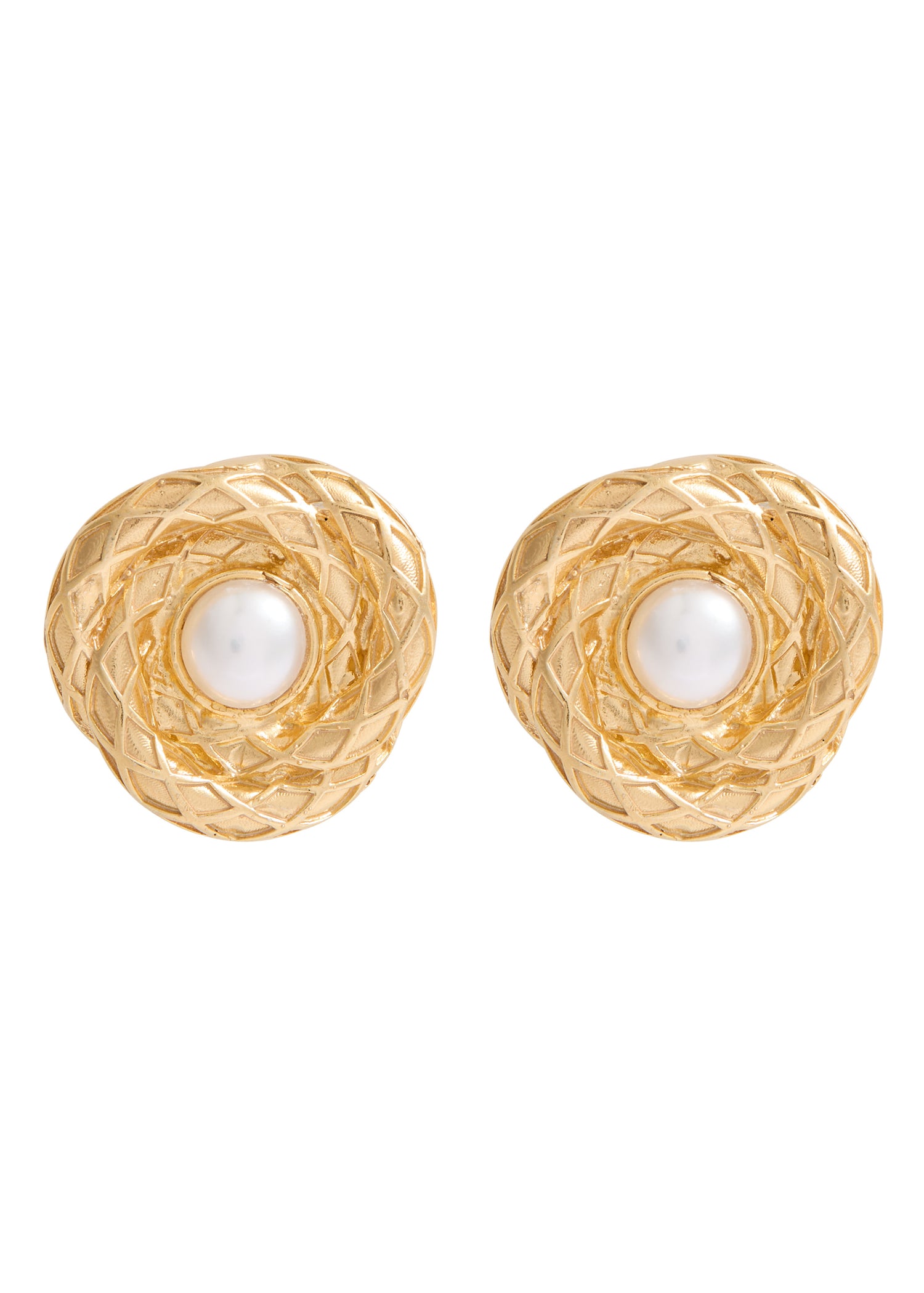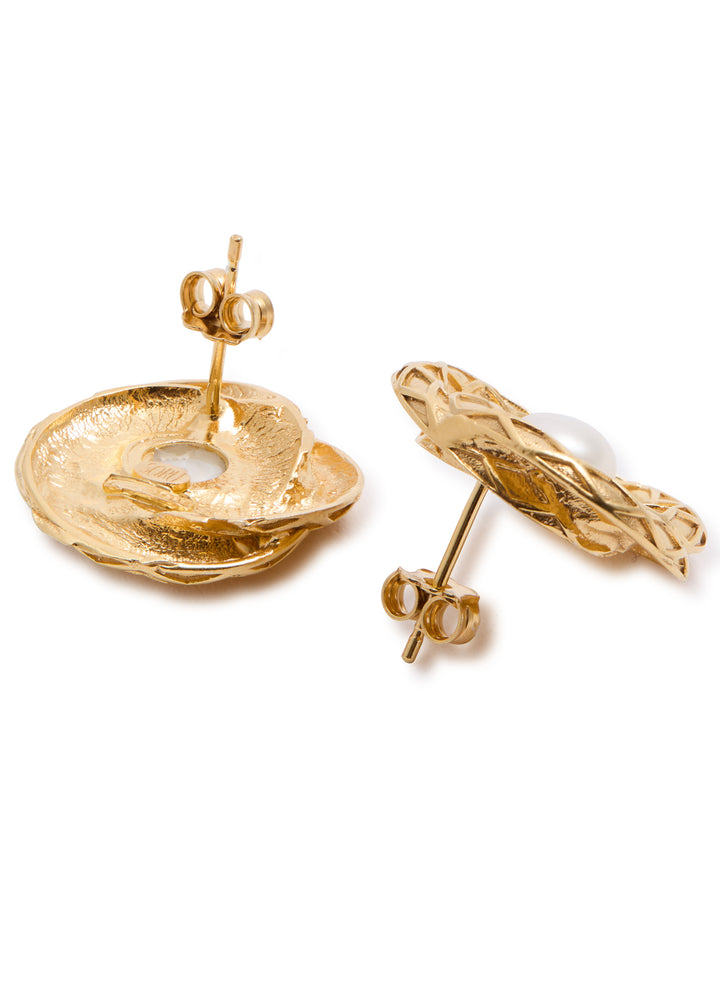 Handmade in 18kt gold-plated silver with a twisted texture and baroque pearl embellishment, butterfly fastening for pierced ears. Dimensions: 2.3 cm x 2.3 cm.