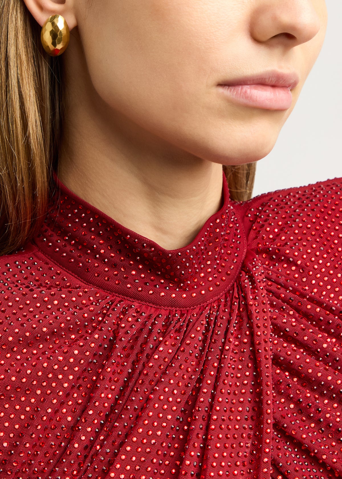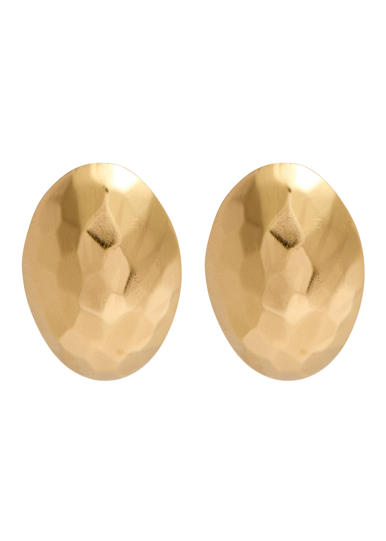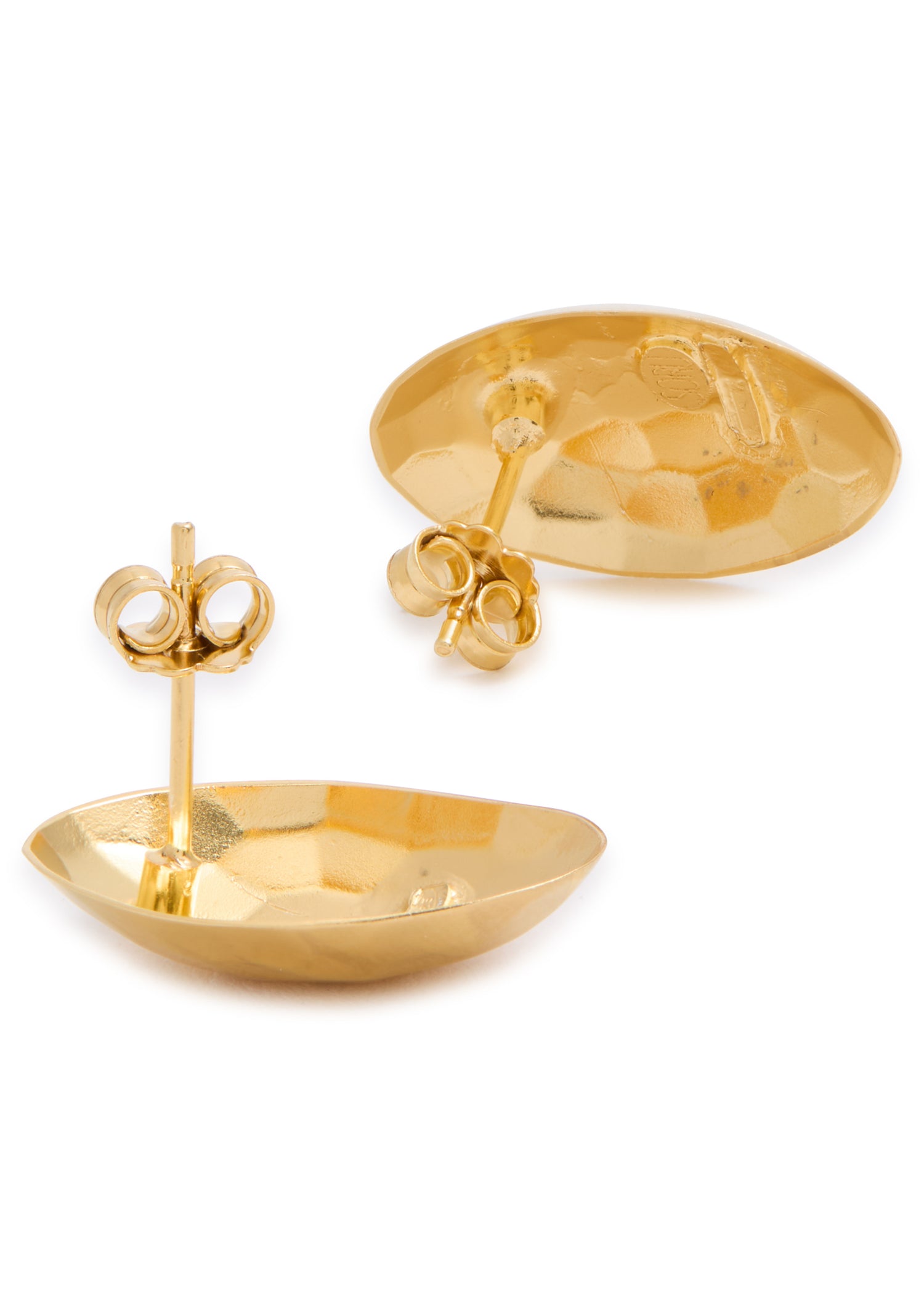 Handmade in 18kt gold-plated silver with a hammered dome design, butterfly fastening for pierced ears. Dimensions: 1.5 cm x 2.3 cm.