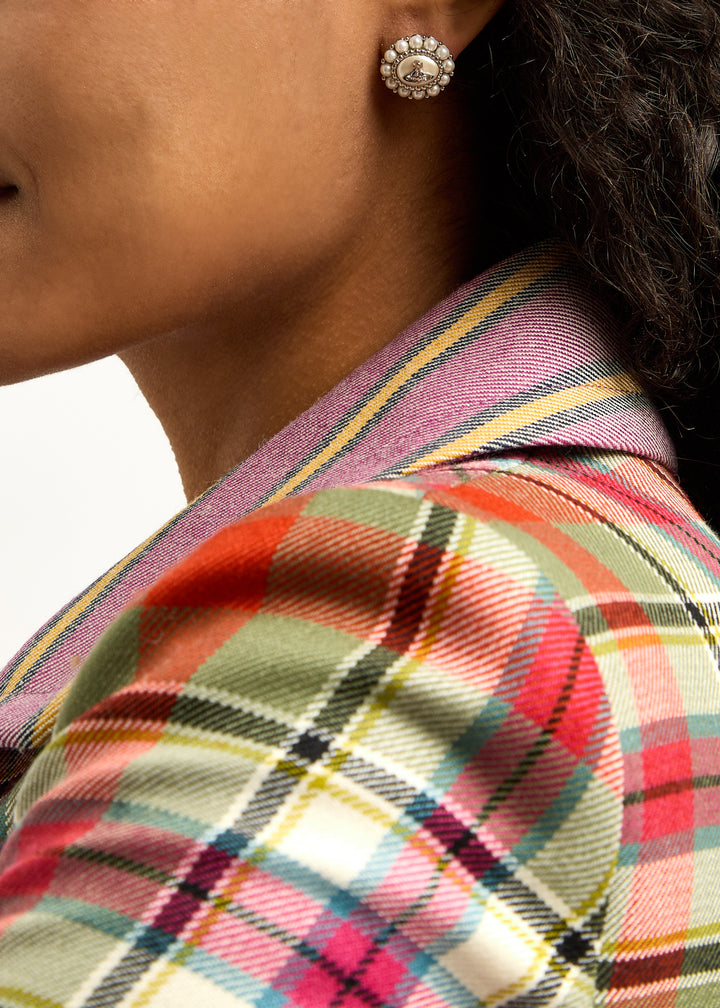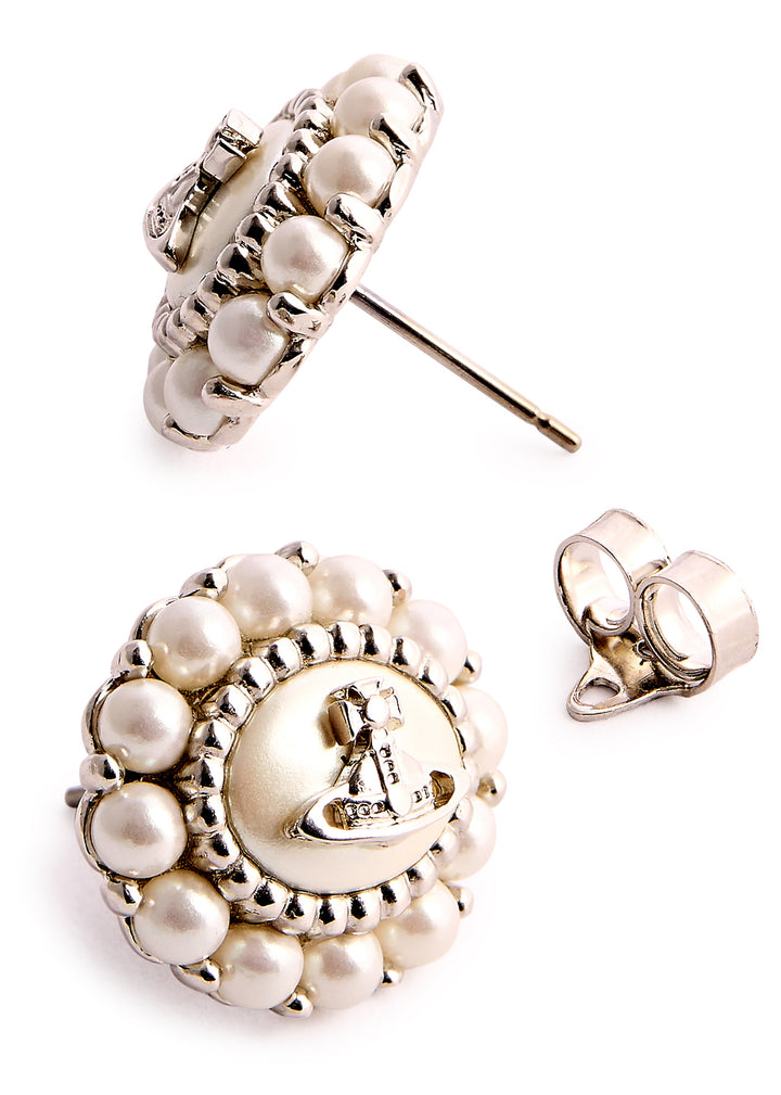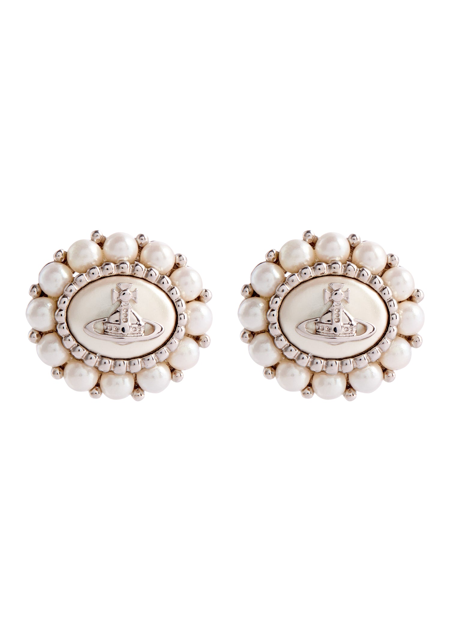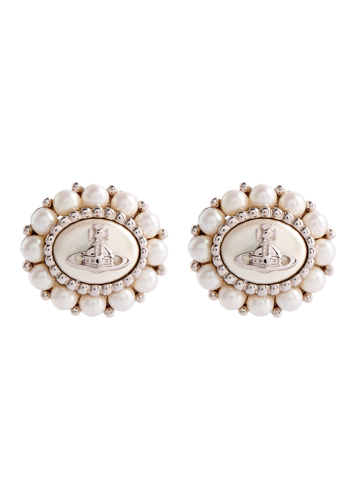 These Amaya Orb-Embellished Stud Earrings by Vivienne Westwood showcase the brand’s iconic orb motif with glass pearl accents, embodying a mix of rebellious and sophisticated style. These earrings are a statement in themselves, capturing Vivienne Westwood’s signature avant-garde aesthetic.