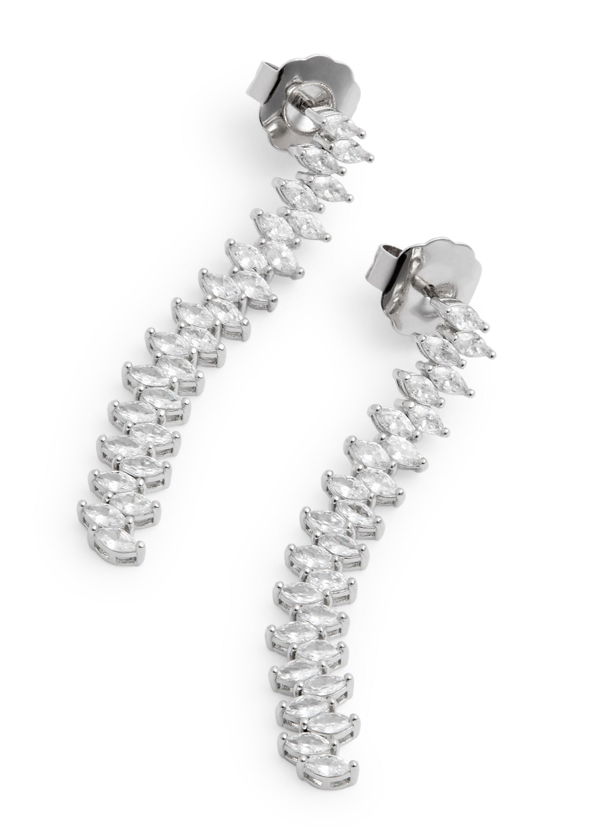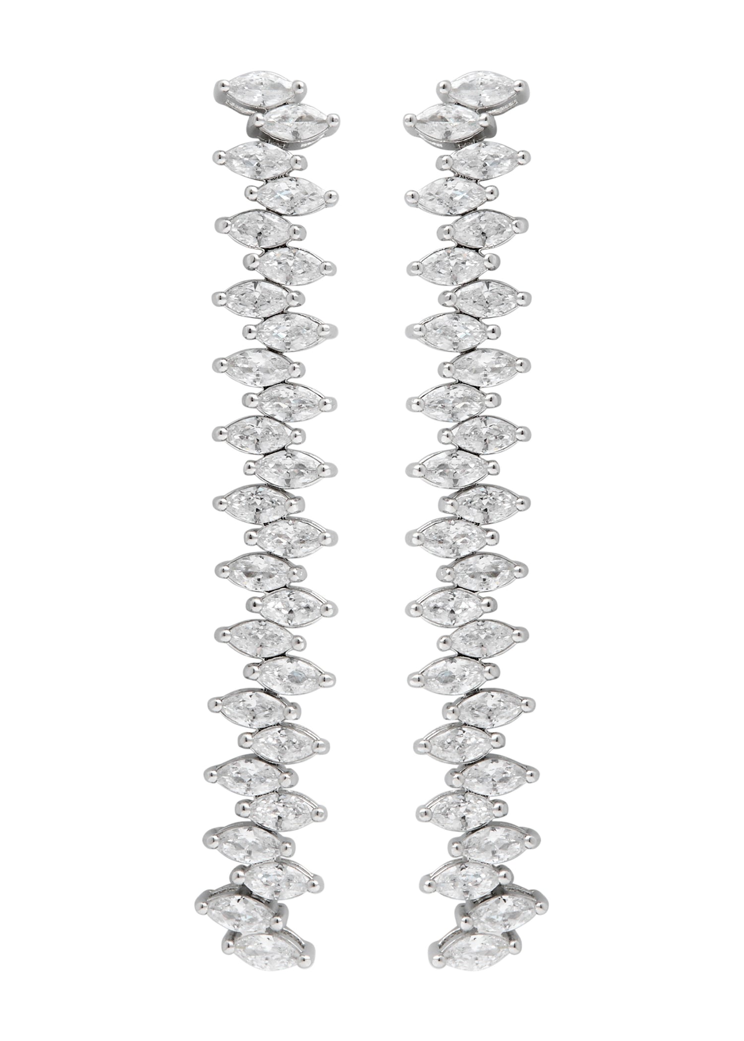 Rhodium-plated with crystal embellishments, butterfly fastening for pierced ears, with a drop length of 4.6 cm.