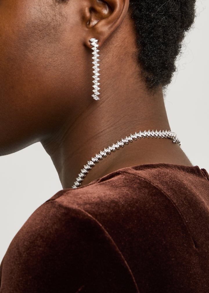 These Crystal-Embellished Rhodium-Plated Drop Earrings by Cz By Kenneth Jay Lane showcase a refined, elongated design that adds sophistication to any outfit. Embellished with crystals, they capture the allure of red-carpet style with a modern twist.