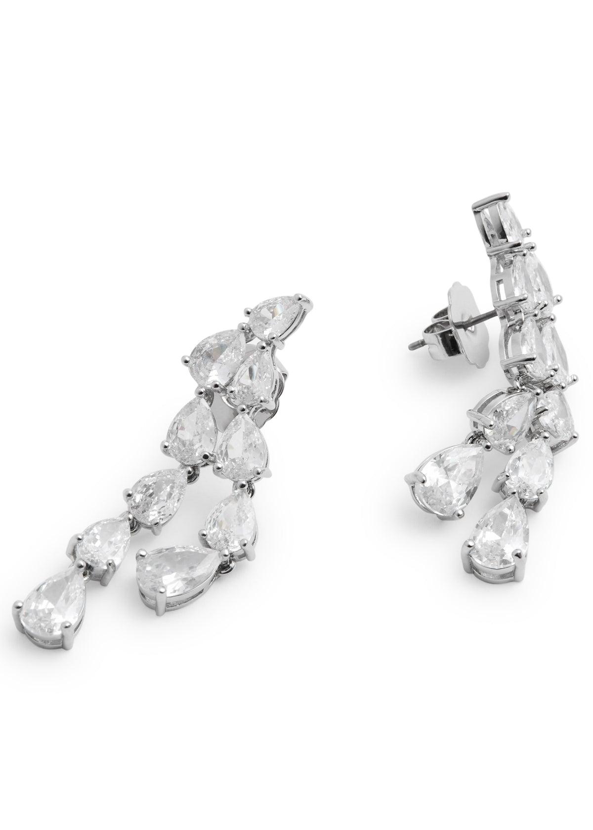 Rhodium-plated with double-layered fringe and crystal embellishments, butterfly fastening for pierced ears, with a drop length of 4.5 cm.