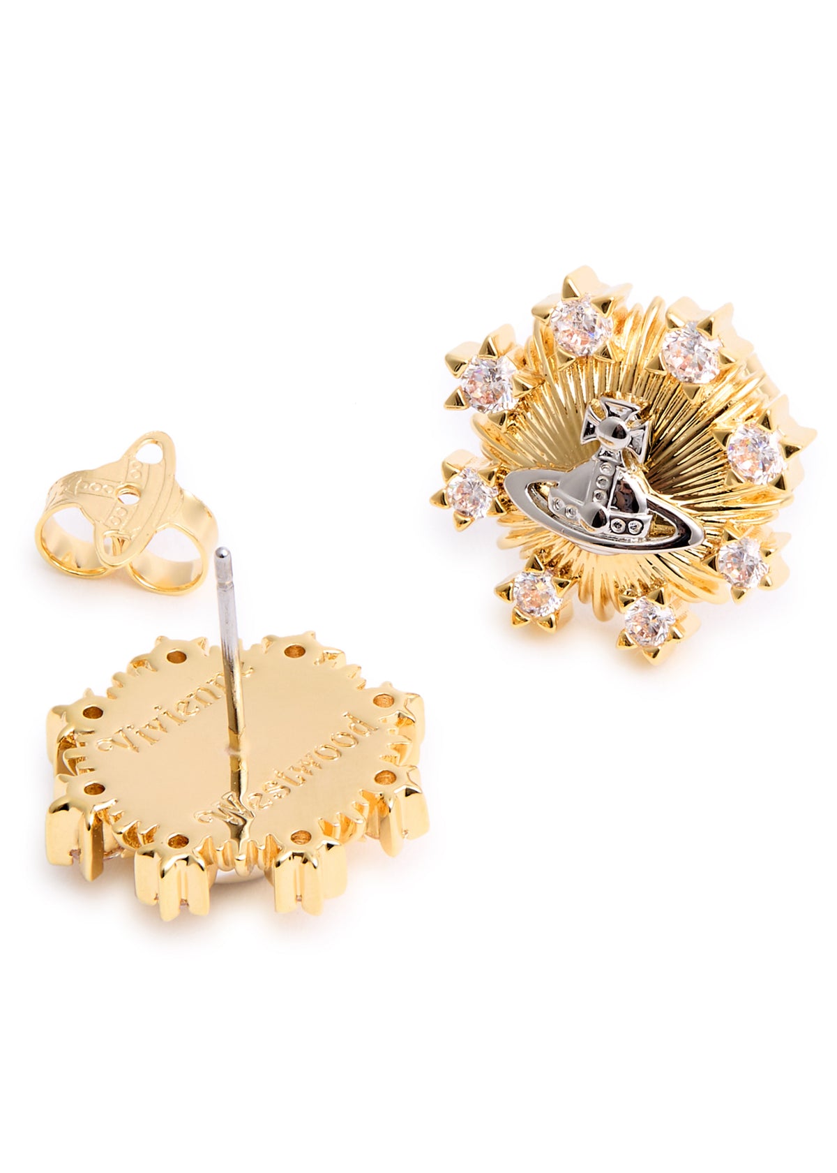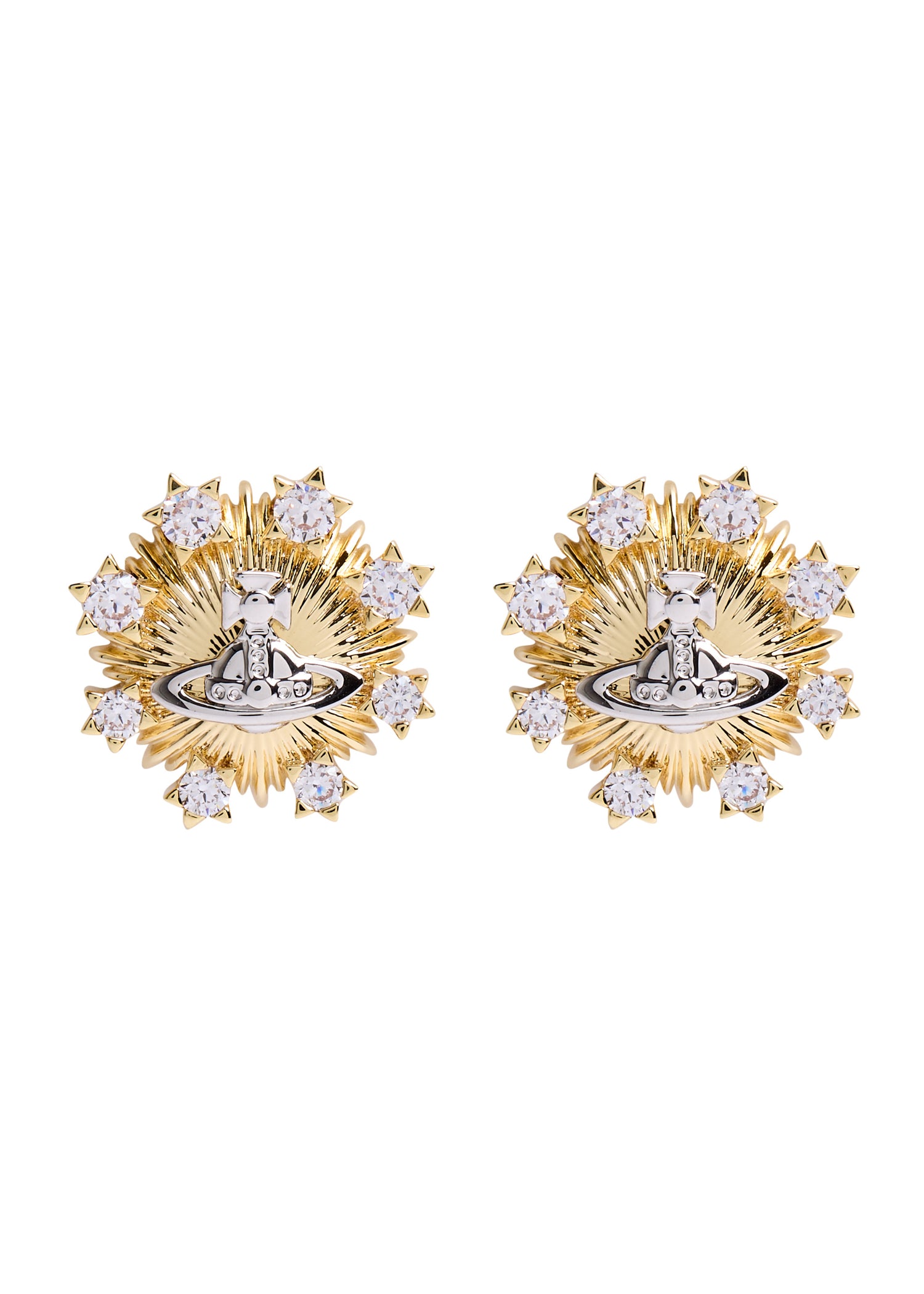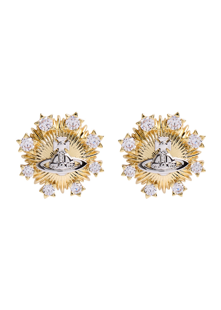 These Tara Orb-Embellished Stud Earrings by Vivienne Westwood showcase a textured sunray design with a central orb plaque, accented by crystal embellishments. Elegant yet edgy, they reflect Vivienne Westwood’s unique mix of tradition and unconventional style.