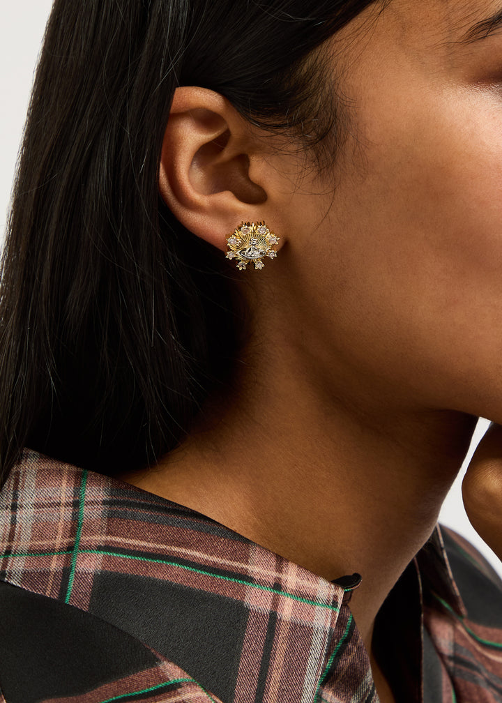 Textured sunray design with crystal embellishments and orb plaque, butterfly fastening for pierced ears, dimensions: 1.5 cm x 1.5 cm.