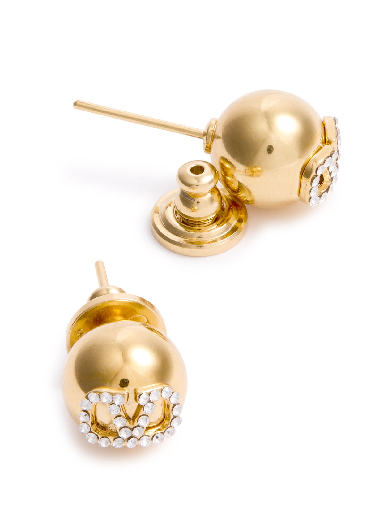Gold-tone metal with crystal embellishments, VLogo plaque, post fastening for pierced ears, dimensions: 1 cm x 1 cm.