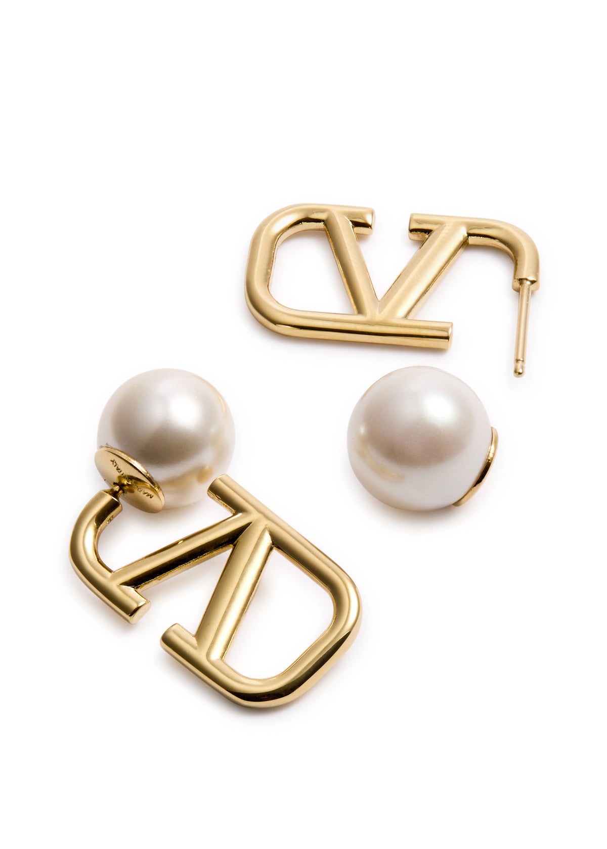 Gold-tone metal with faux pearl embellishments, VLogo design, designer engraved, post fastening for pierced ears, drop length: 1.75 cm.