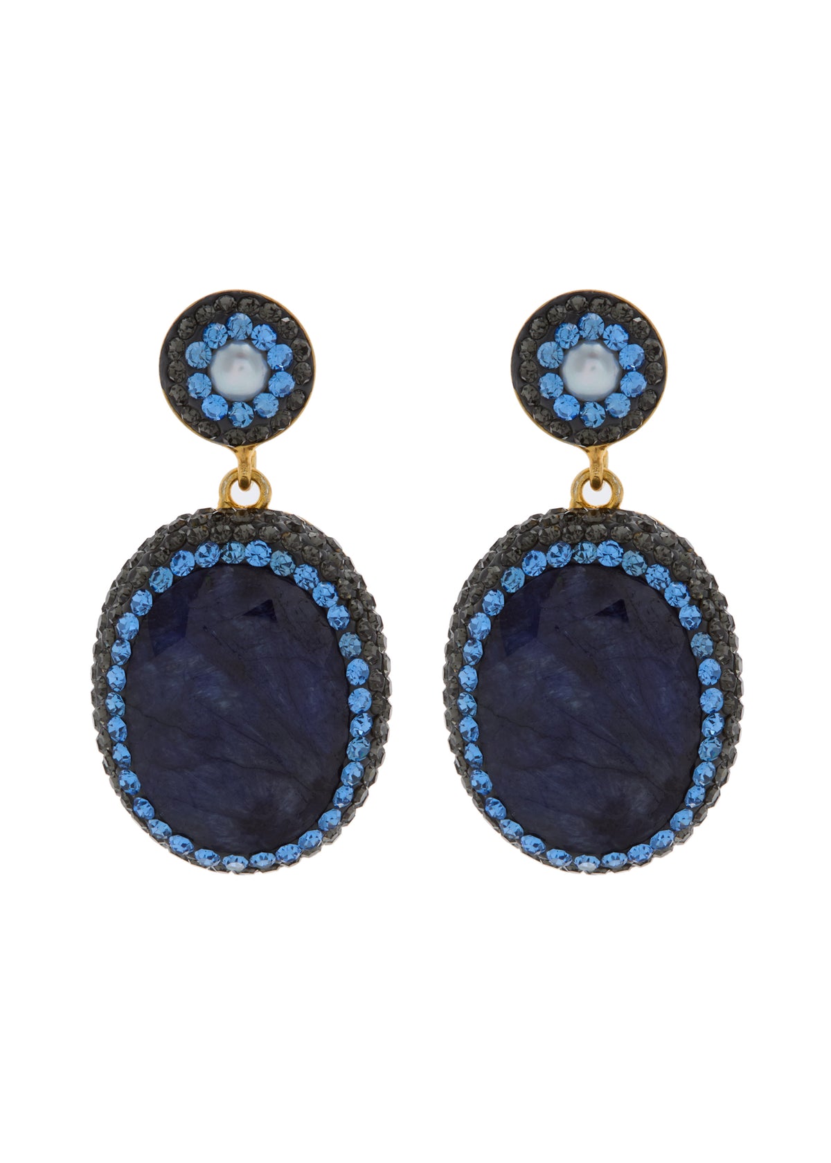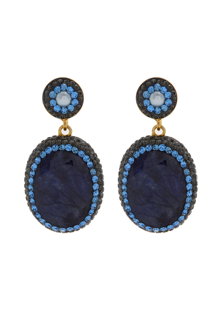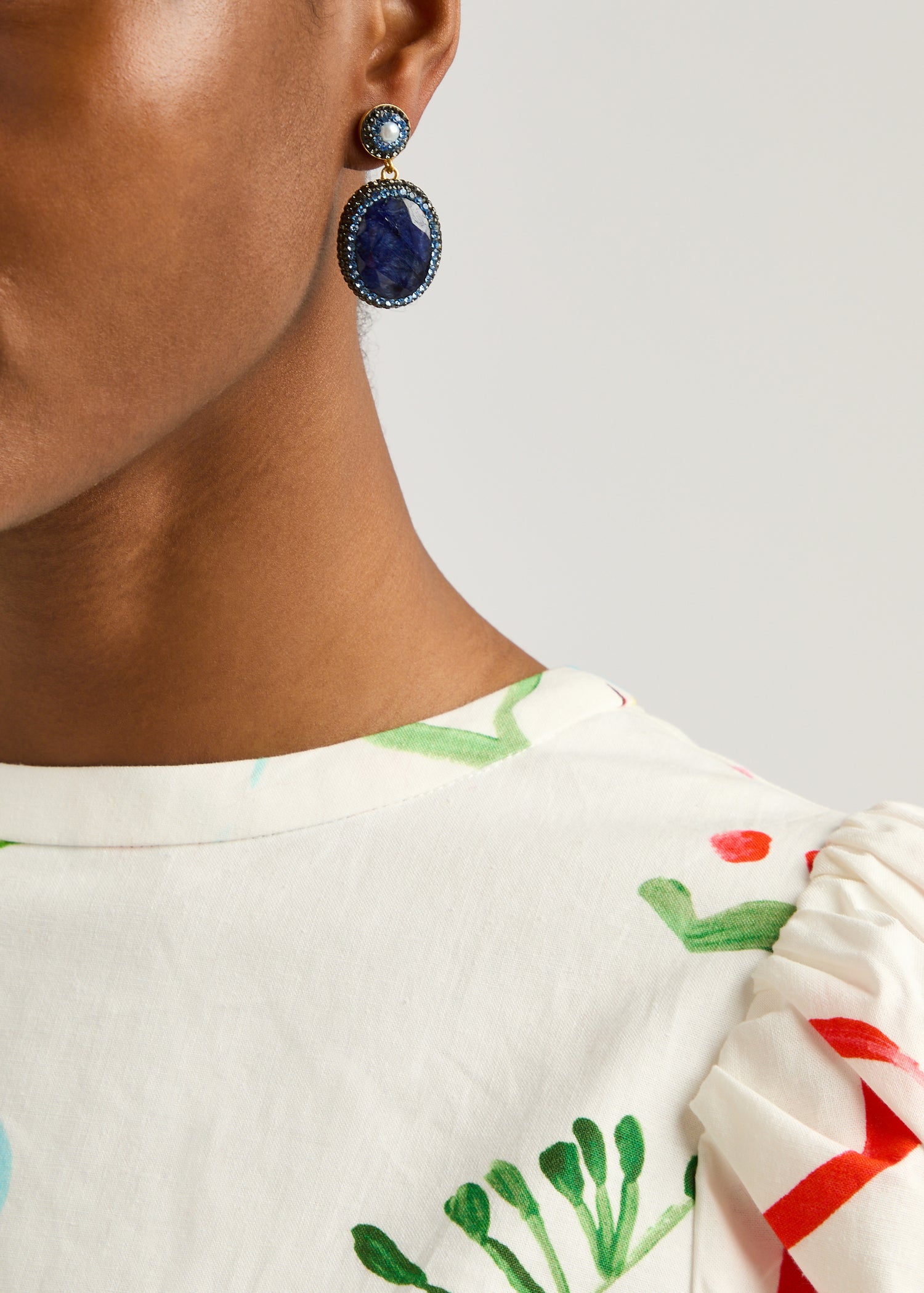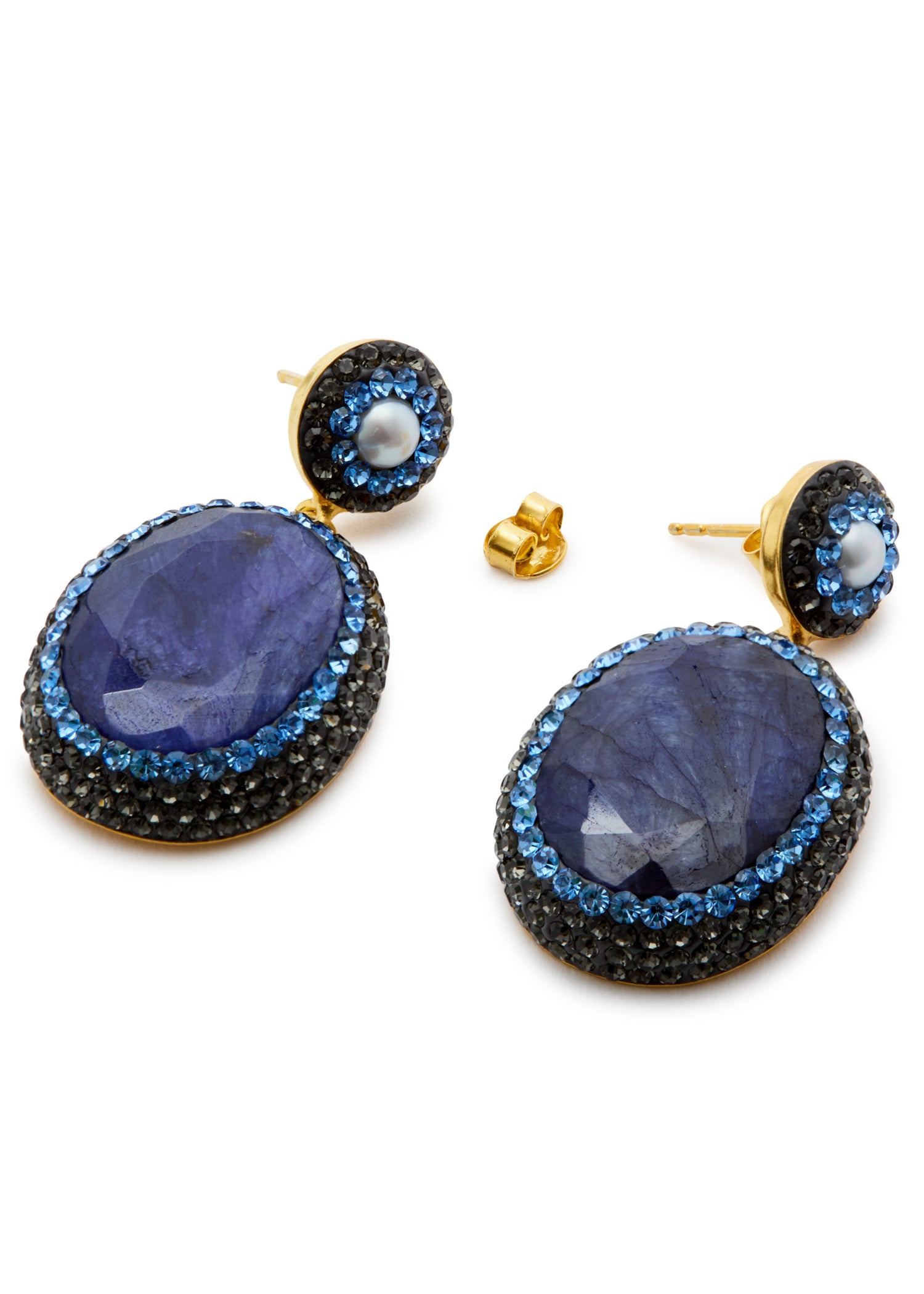 These Sapphire 18kt gold-plated drop earrings by Soru Jewellery showcase the brand’s signature bohemian-inspired luxury. With a stunning combination of crystal, sapphire stone, and baroque pearl embellishments, these handcrafted earrings embody natural beauty and opulent design. Ideal for those who embrace standout, artisanal jewelry.