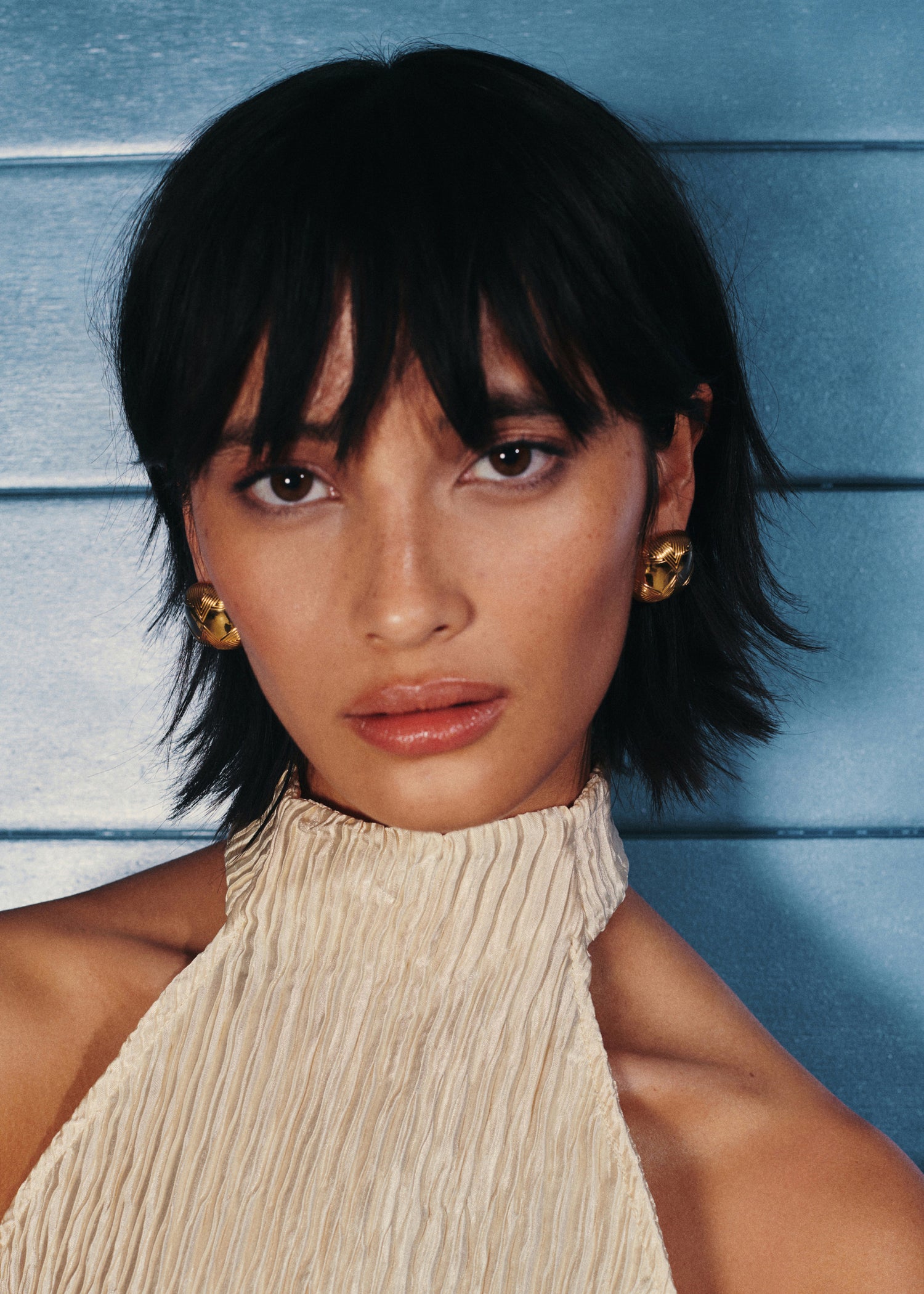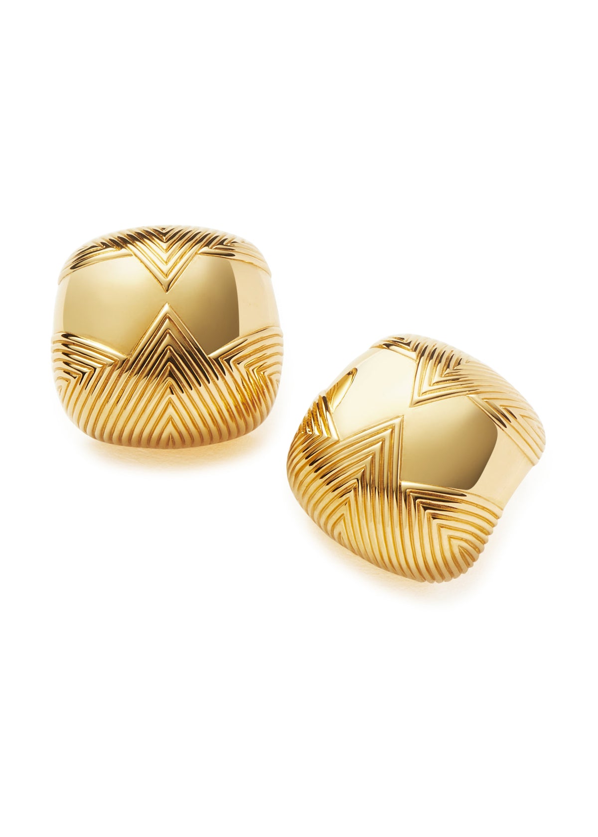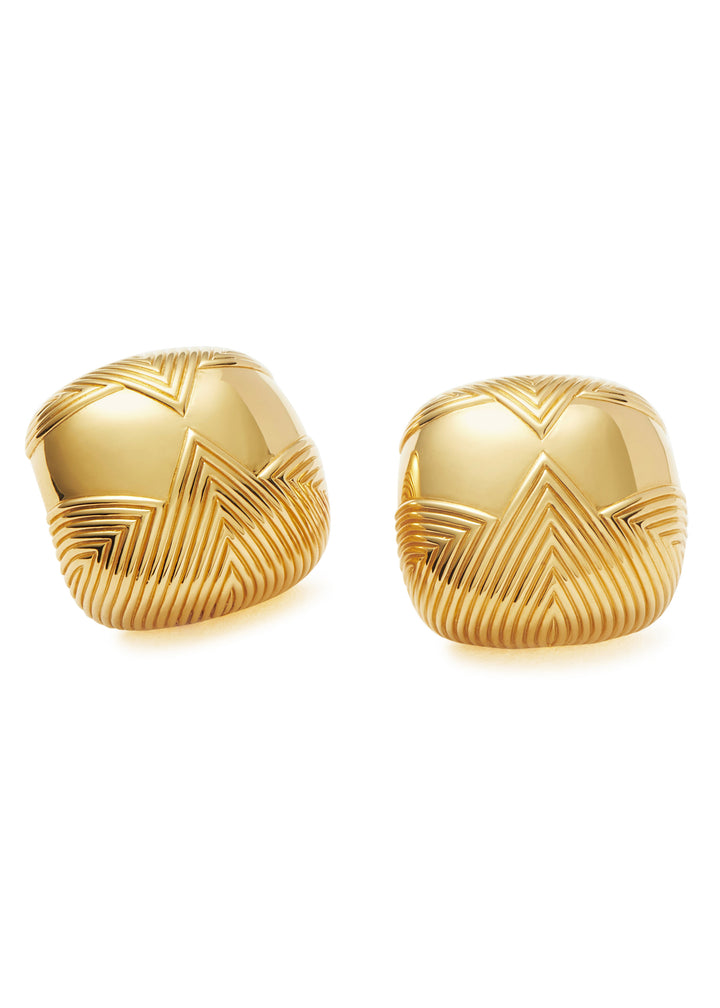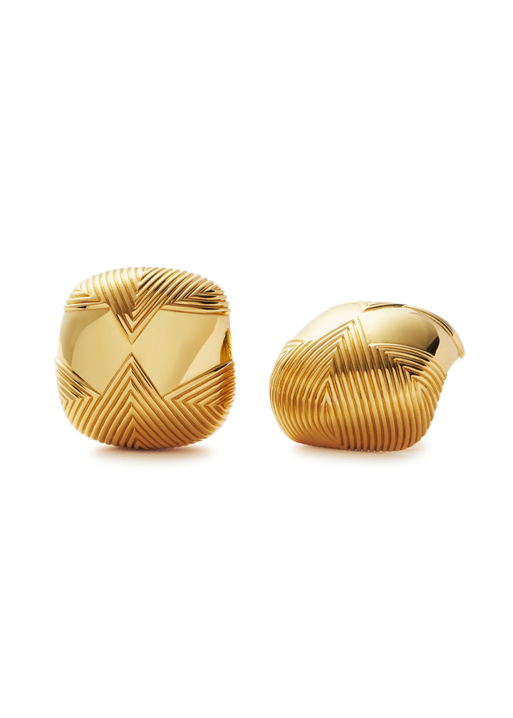 Made from recycled 18kt gold-plated metal with an oversized, textured dome design. Dimensions: 2.3cm x 2.4cm. Butterfly fastening for pierced ears.
