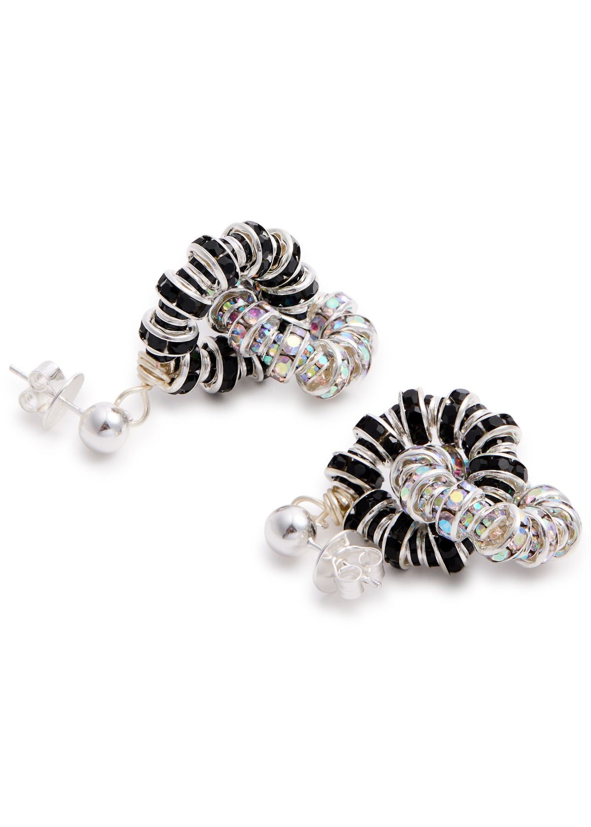 These Tiny Tires embellished earrings by Pearl Octopuss.y feature an interlocking hood pendant adorned with black and iridescent crystal embellishments. Each piece is meticulously handmade, celebrating individuality and a sculptural approach to jewelry. Perfect for those seeking artistic, statement pieces.
