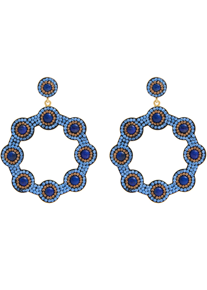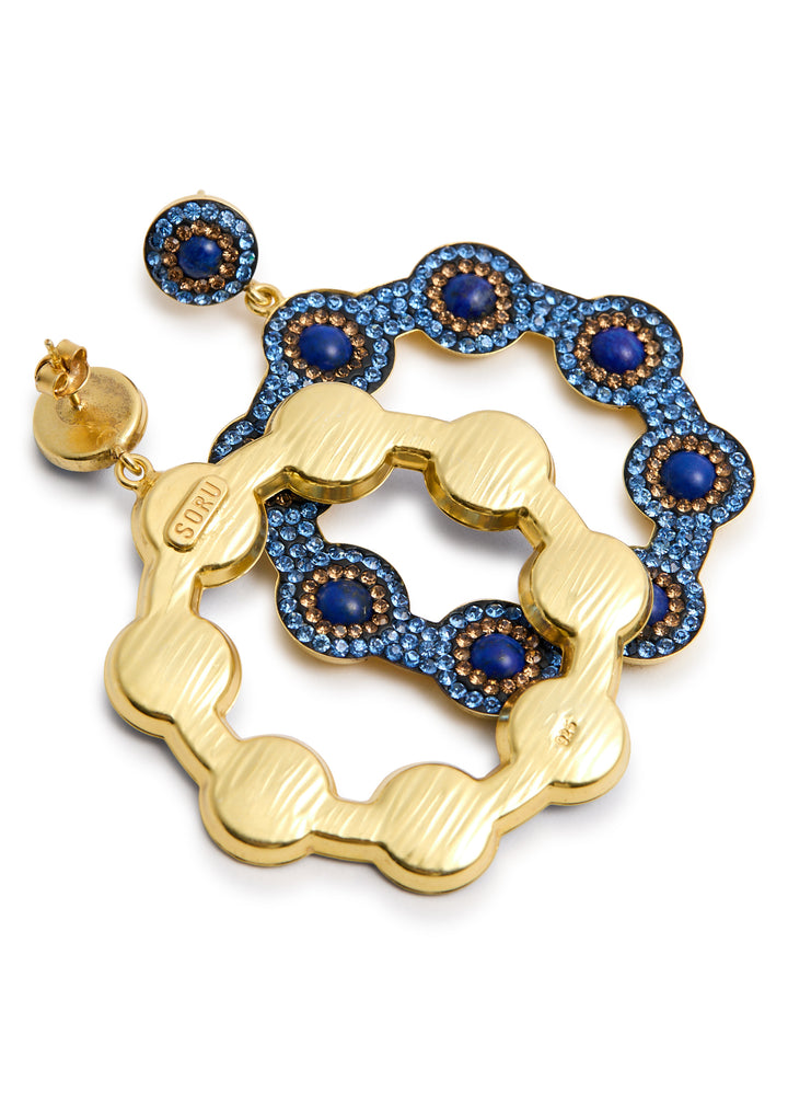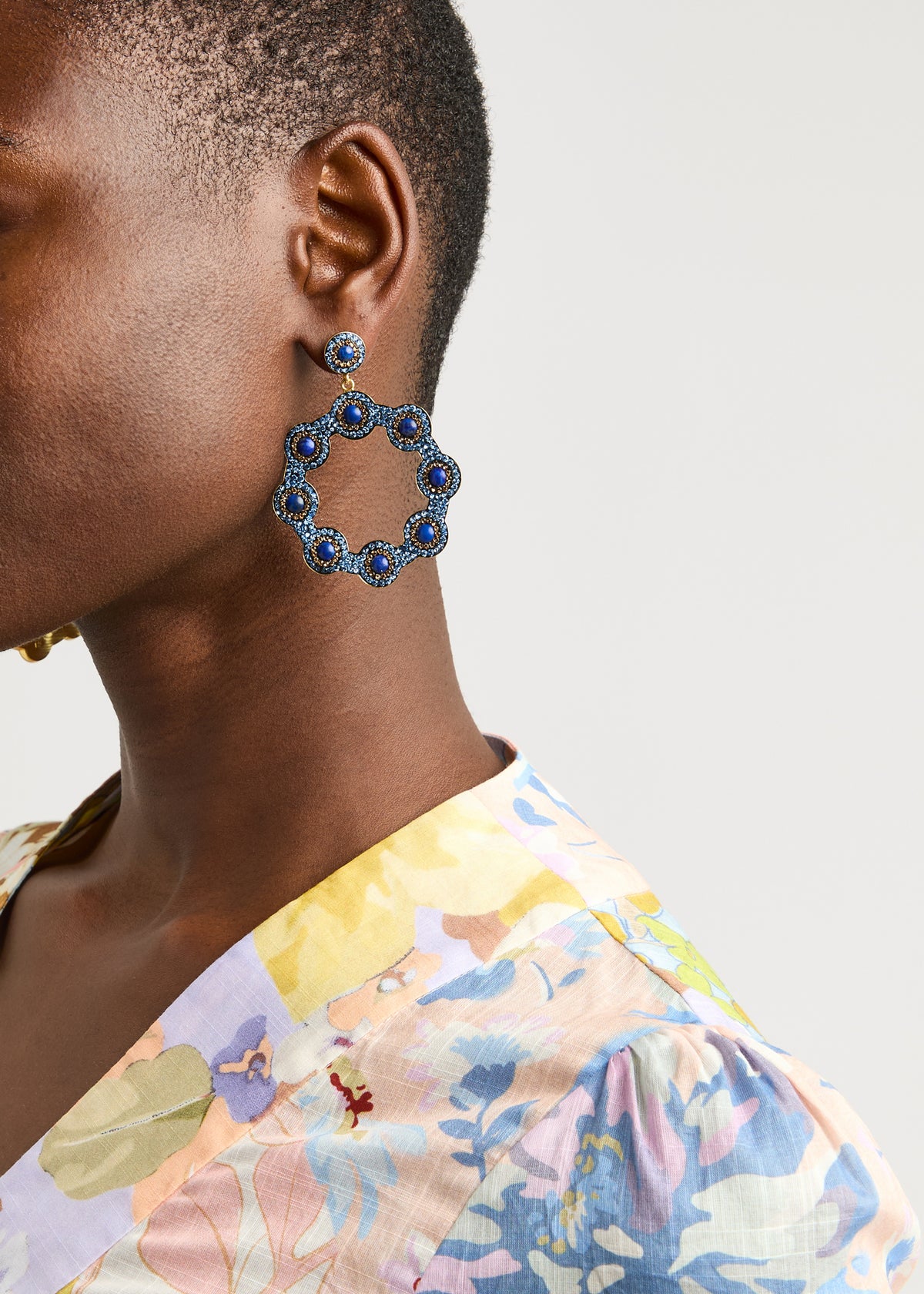 Handcrafted from 18kt gold-plated silver with lapis lazuli and crystal embellishments. Hoop dimensions: 5cm x 5cm. Butterfly fastening for pierced ears.
