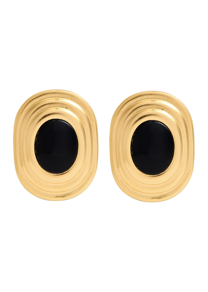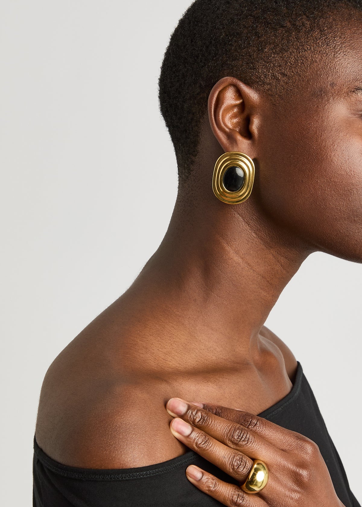 These Coco 18kt gold-plated stud earrings by Soru Jewellery showcase an oversized, ribbed design with an oval black onyx centerpiece. Combining boldness with a refined, bohemian flair, these studs are ideal for those seeking standout jewelry with a touch of glamour.