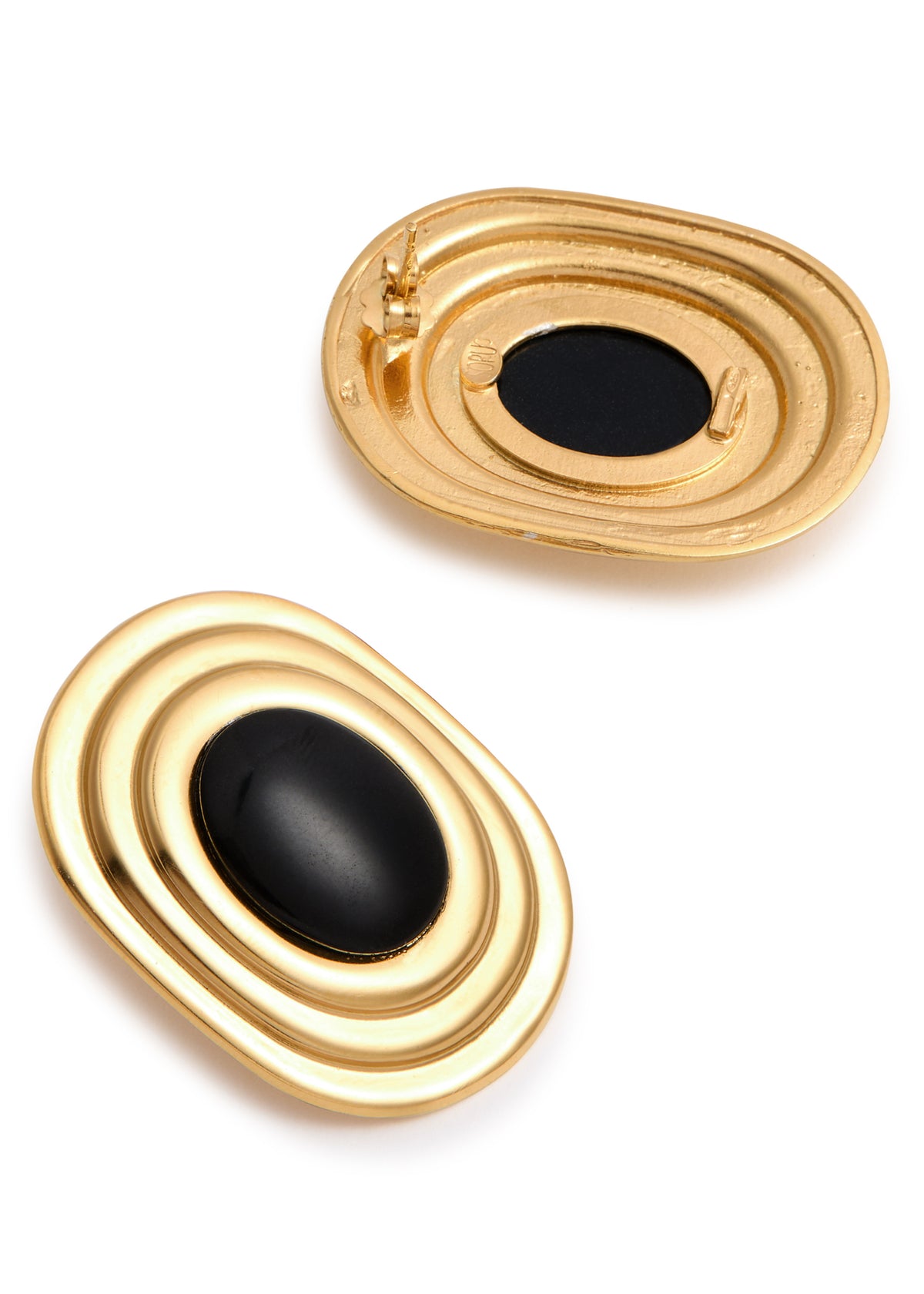Crafted from 18kt gold-plated silver with an oval black onyx embellishment. Dimensions: 4.5cm x 3cm. Butterfly fastening for pierced ears.