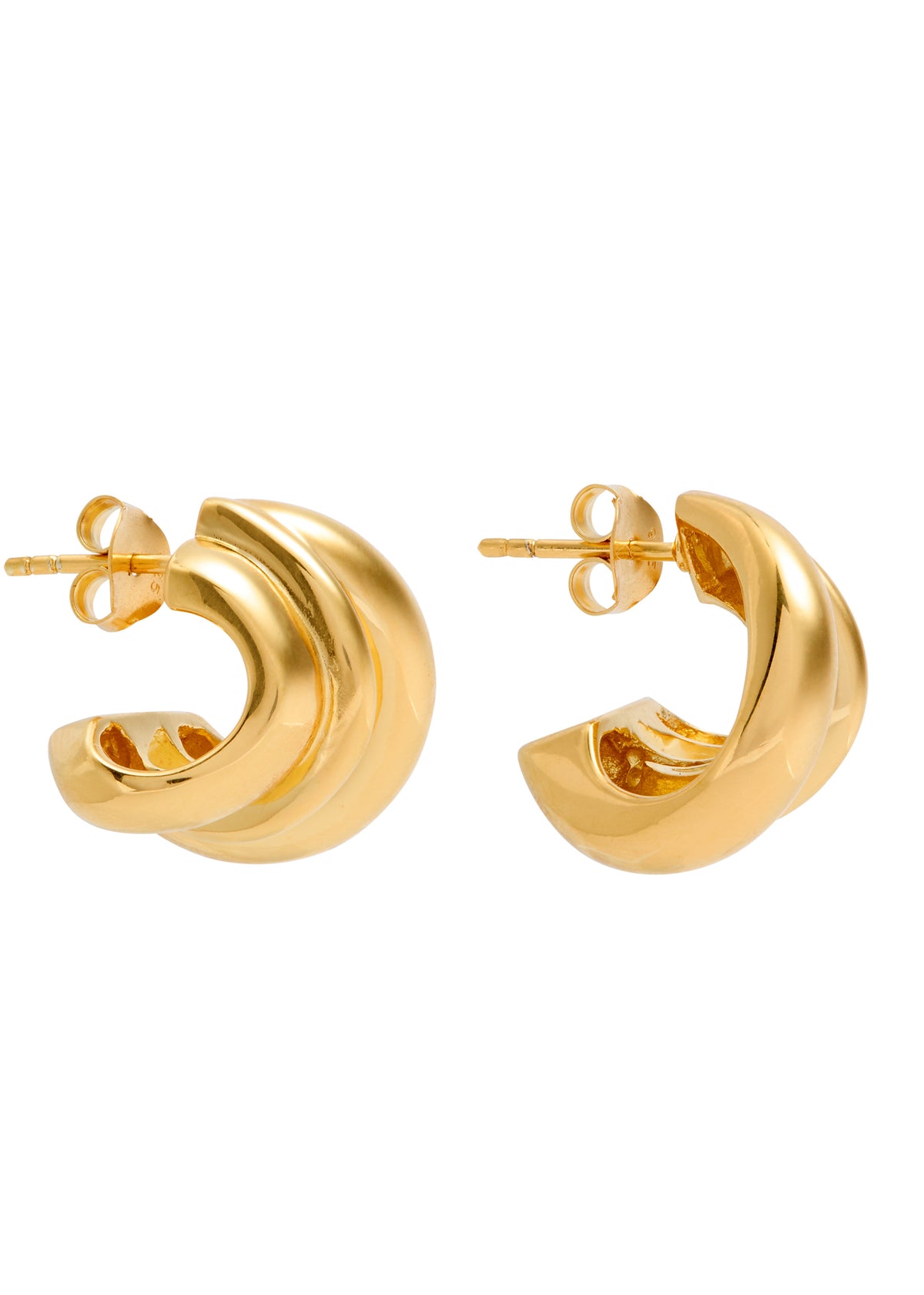 Crafted in 14kt gold vermeil with a ridged triple-layer hoop design. Drop length is 1.5cm, with a butterfly fastening suitable for pierced ears.