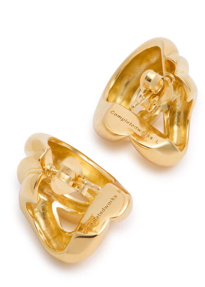 These Dollop 14kt gold vermeil earrings by CompletedWorks are designed with a ridged triple-layer hoop, showcasing the brand’s minimalist yet art-inspired aesthetic. Their structured silhouette and intricate detailing make them versatile for both everyday wear and special occasions, embodying CompletedWorks’ commitment to craftsmanship and unique design.