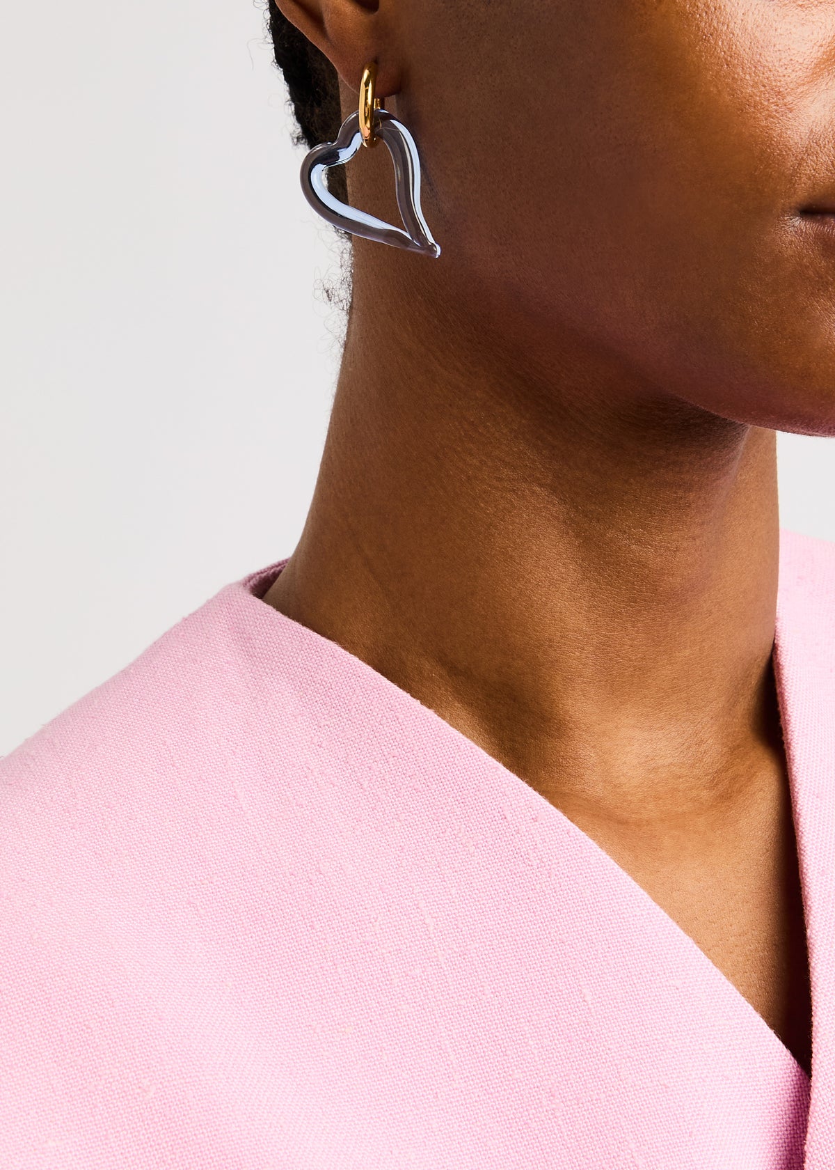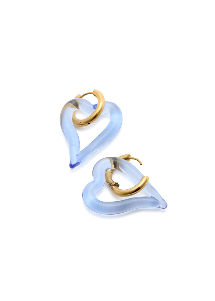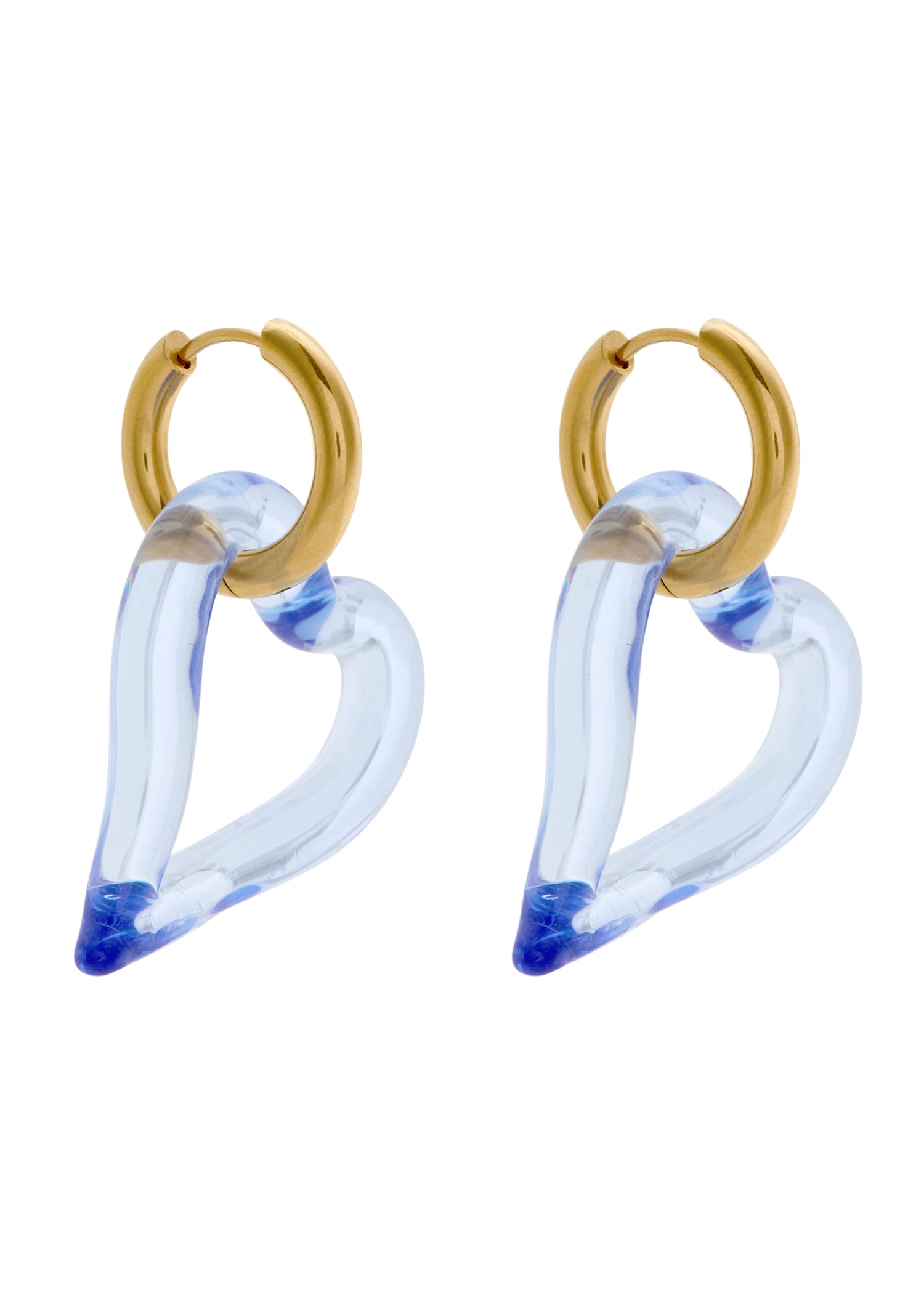 Crafted in 18kt gold plating with a detachable lampwork glass heart charm. Hoop dimensions are 1.7cm x 1.7cm; heart dimensions are 2.5cm x 3.5cm. Secured with a sleeper fastening, suitable for pierced ears. Note: due to the unique materials, each piece may vary slightly.
