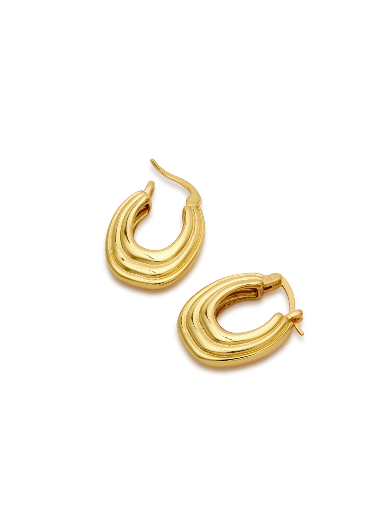 Crafted in 18kt gold plating on sterling silver with a ridged design. Drop length is 2cm, with a sleeper fastening, designed for pierced ears.