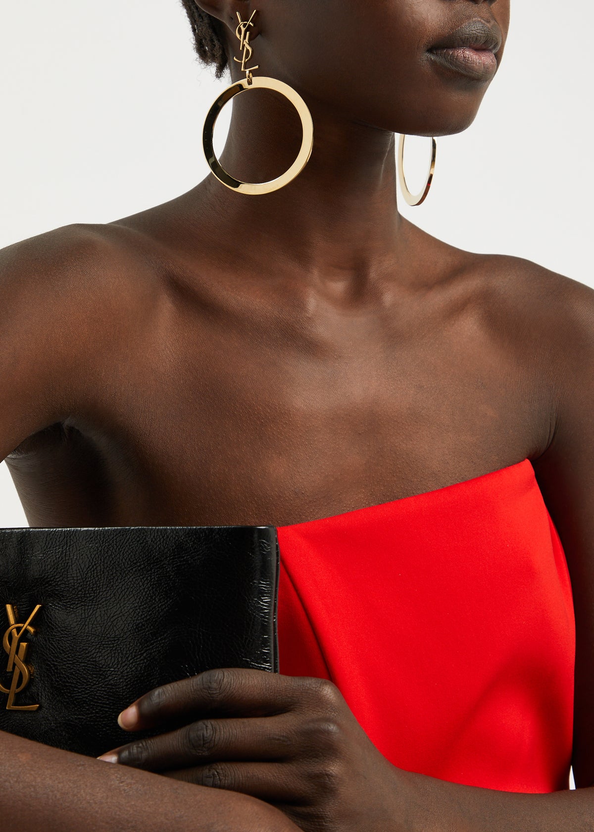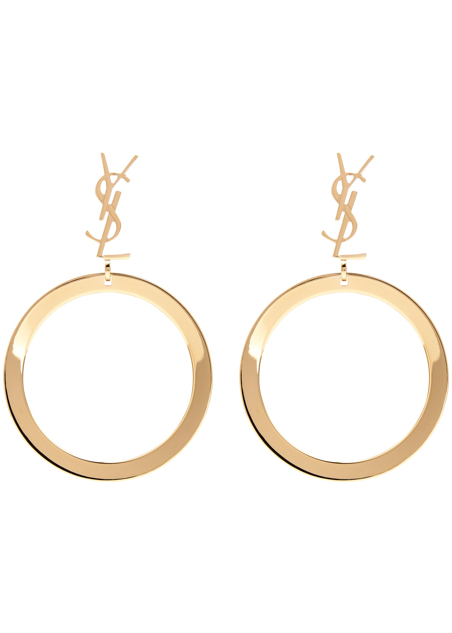 These Cassandre logo drop earrings by Saint Laurent are a sophisticated blend of elegance and rock-chic style. Featuring the brand’s iconic designer plaque and a sleek hoop pendant, these earrings are the perfect addition for those seeking a timeless yet edgy statement piece.