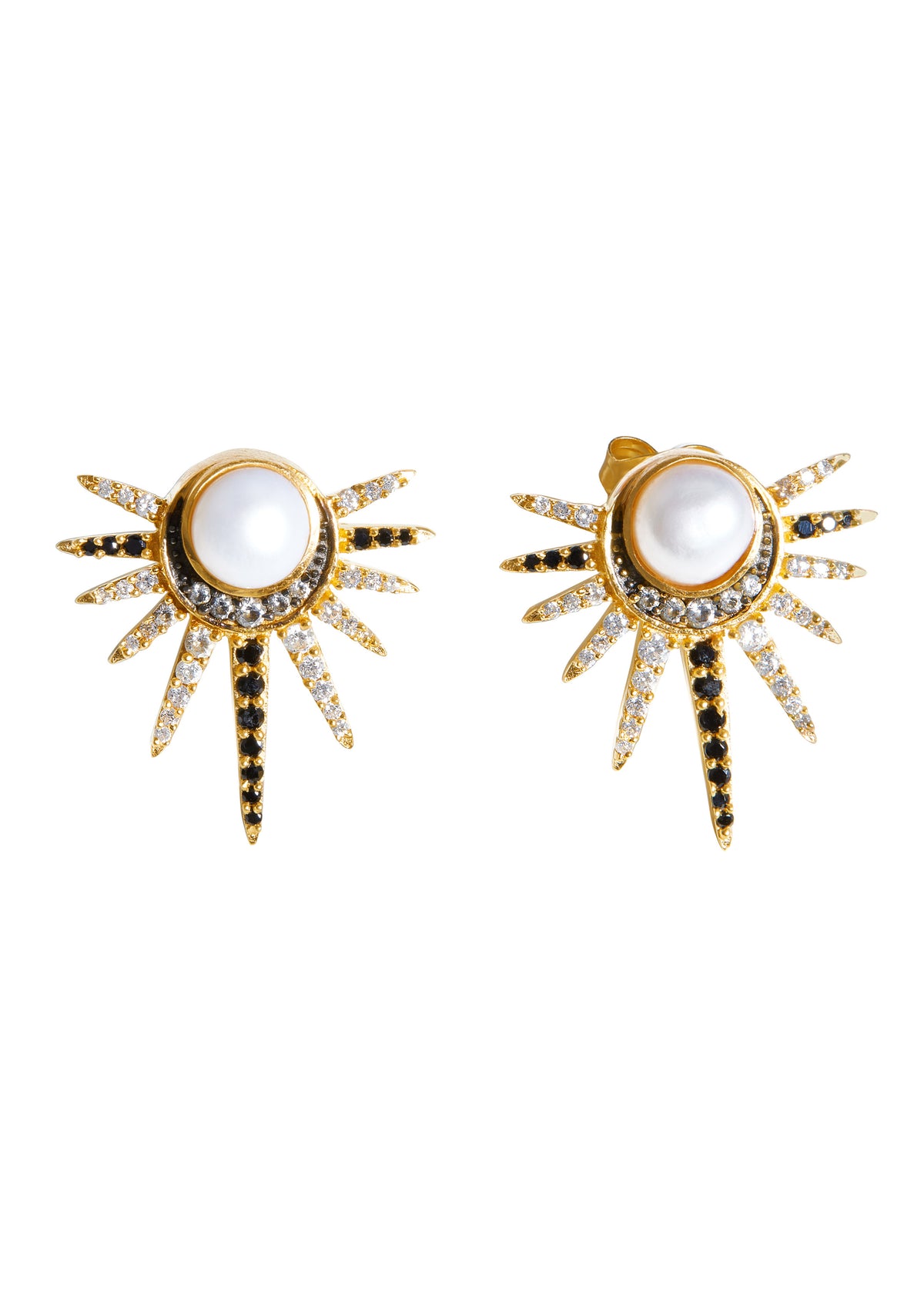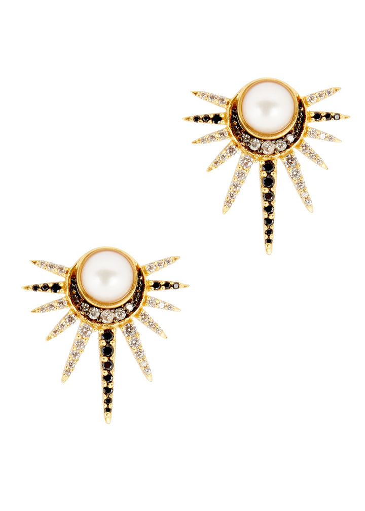 Made in 18kt gold-plated vermeil with a star design, white pearl cabochon, and white and black cubic zirconia pavé embellishments. Dimensions are 2cm x 2cm, secured with a butterfly fastening for pierced ears.