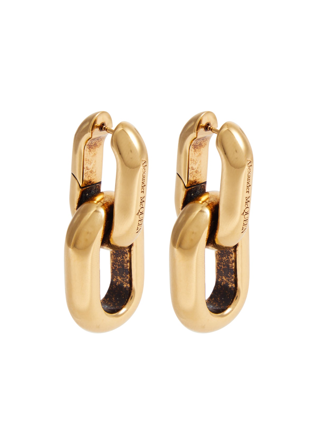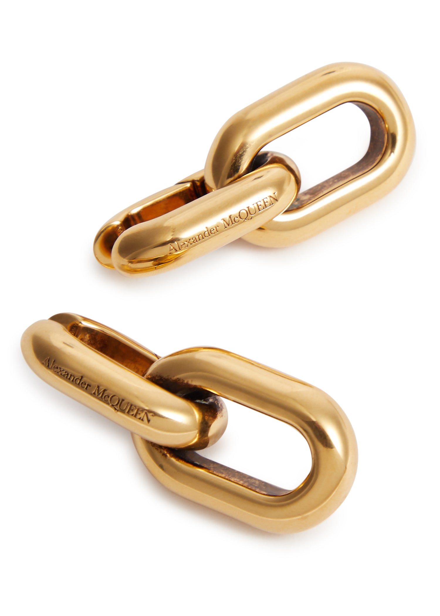 These Peak chain hoop earrings by Alexander McQueen embody the brand’s iconic edgy aesthetic, showcasing a bold chain design with a designer engraving. Perfect for those who appreciate statement pieces with a rebellious touch, these hoops bring a dramatic flair to any look, staying true to McQueen’s avant-garde spirit.
