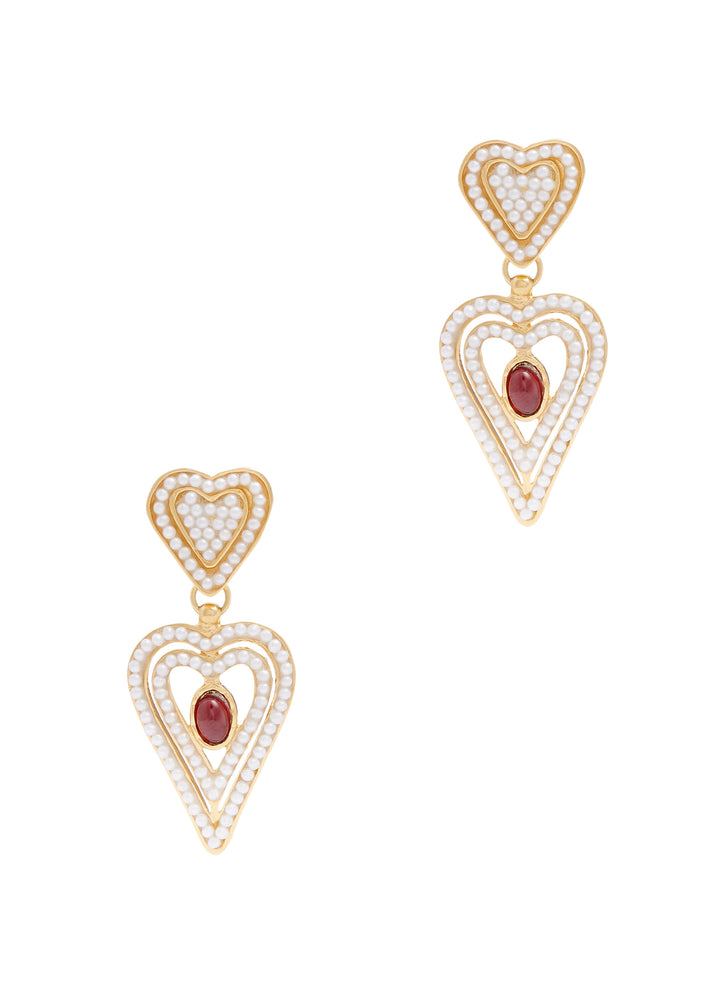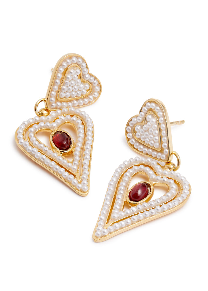 The Amore 18kt gold-plated drop earrings by Soru Jewellery celebrate romantic design with their heart-shaped structure and embellishments of pearls and garnet stones. Handcrafted to perfection, these earrings blend opulent elegance with artisanal beauty, making them perfect for special occasions or adding a touch of glamour to everyday wear.