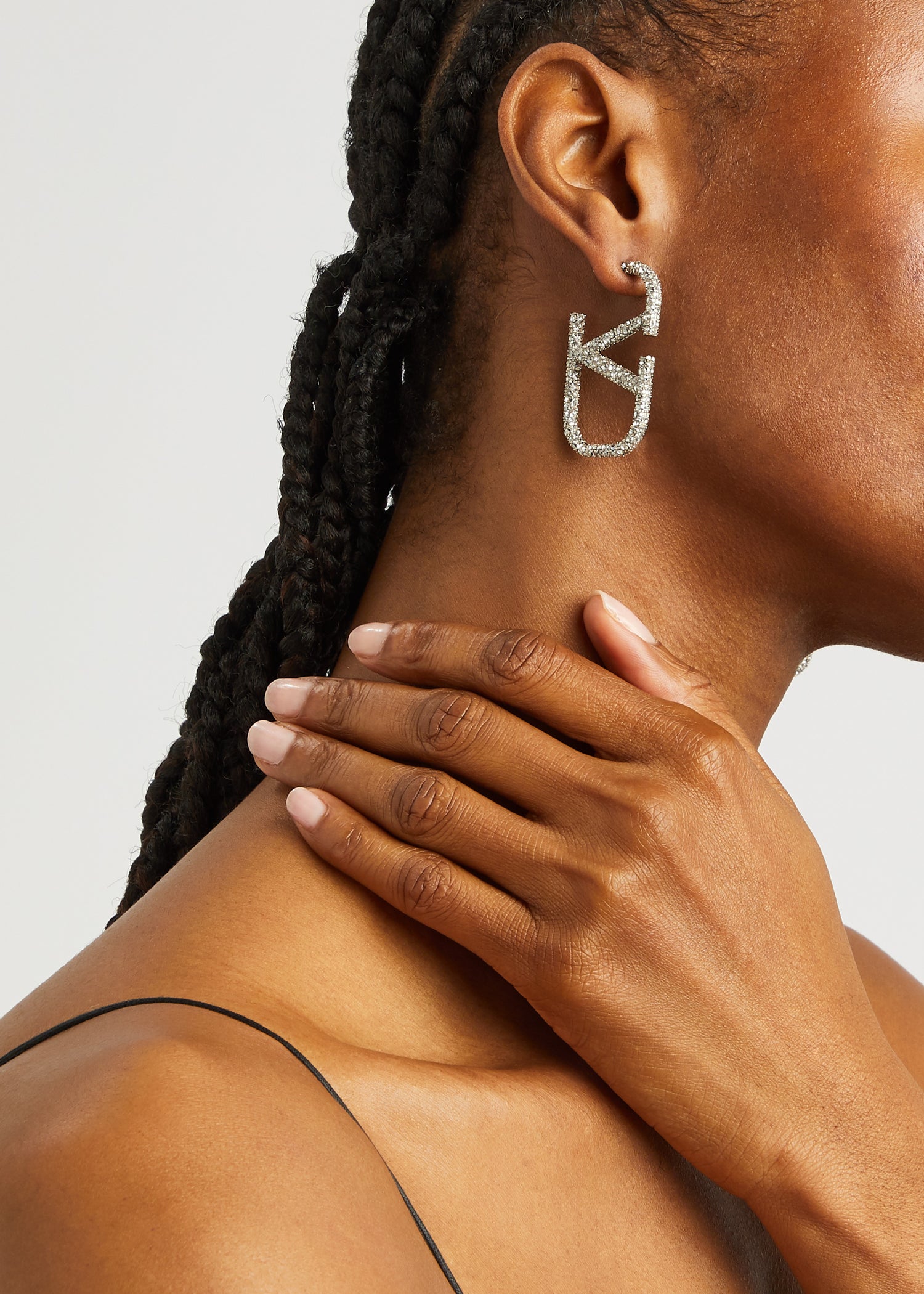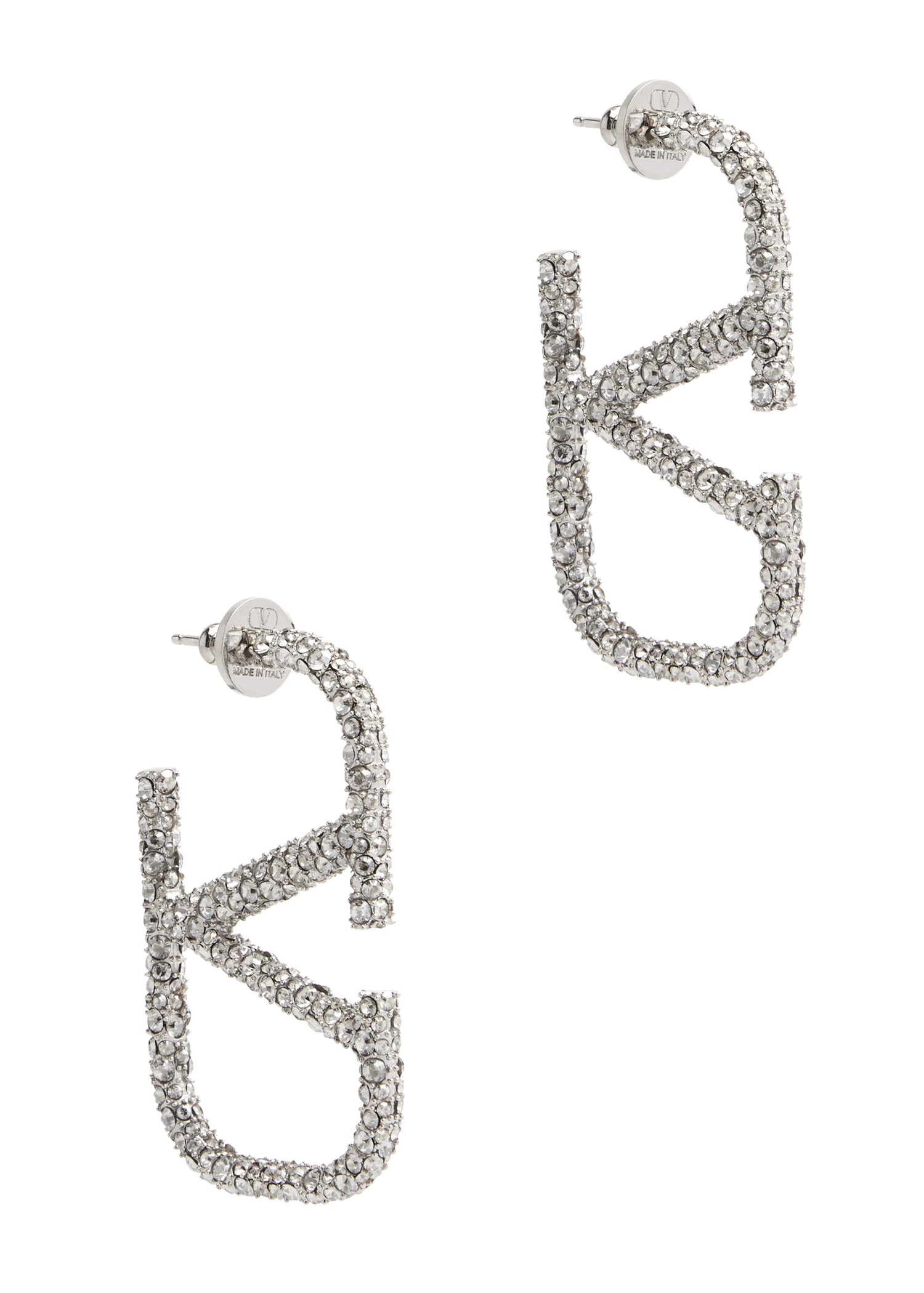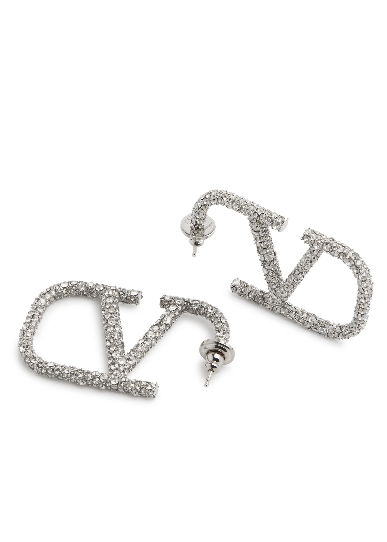 Valentino Garavani’s crystal-embellished hoop earrings showcase the brand’s iconic VLogo, adorned with sparkling Swarovski crystals. These statement hoops exude opulence and elevate any evening look with their bold, glamorous design.