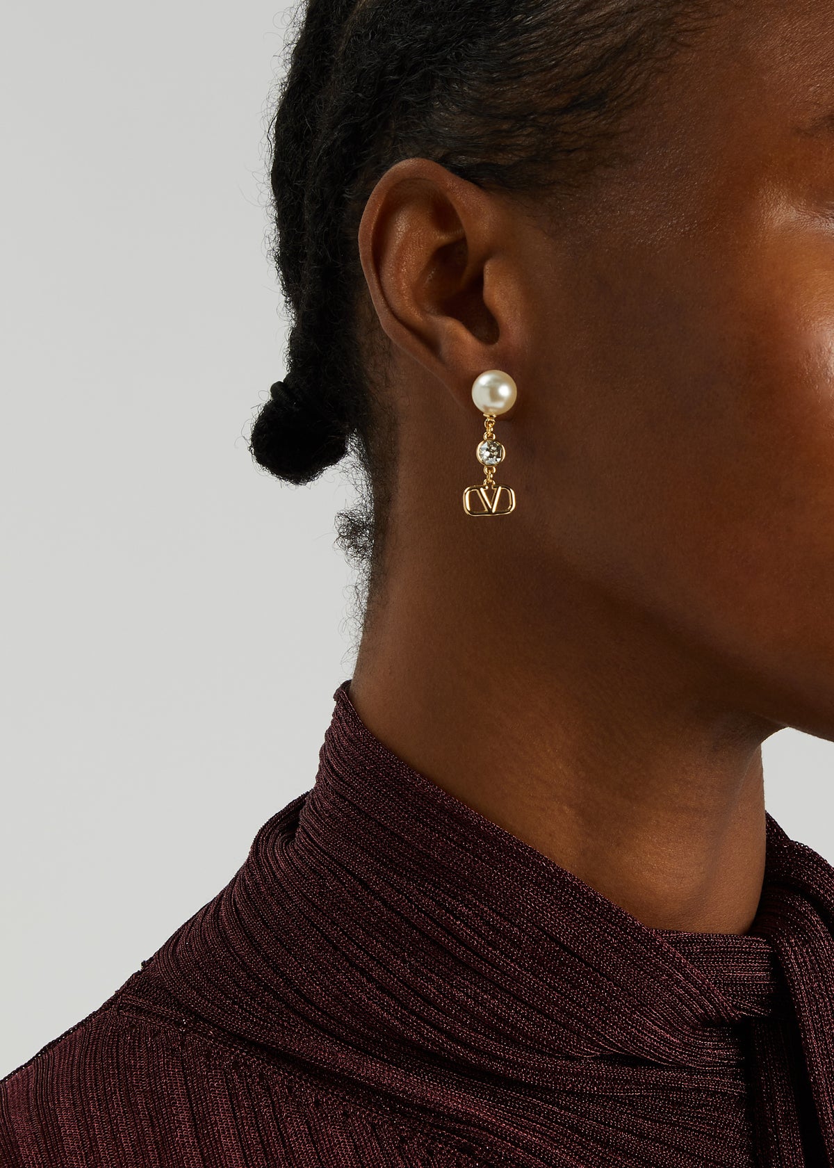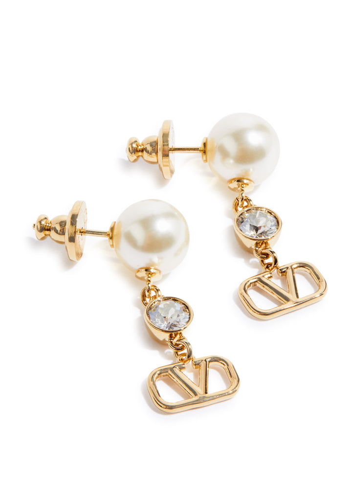 Made with pearl and Swarovski crystal embellishments and featuring a hanging VLogo charm. Drop length: 2.5cm. Post fastening for pierced ears. Presented in a designer-stamped box.