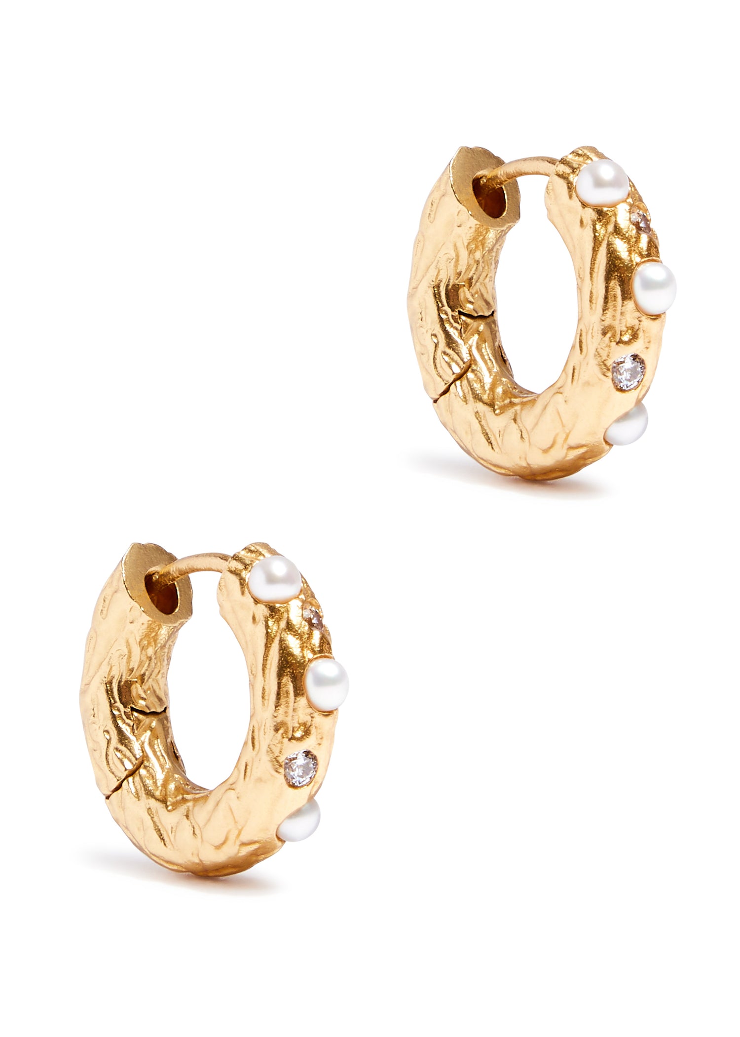Handmade in 18kt gold-plated metal with crystal and pearl embellishments, textured design. Drop: 1.5 cm. Sleeper fastening for pierced ears. Presented in a designer-stamped box.