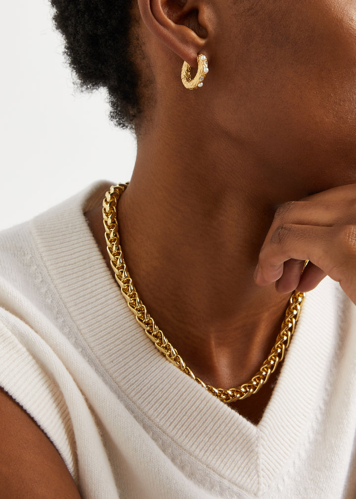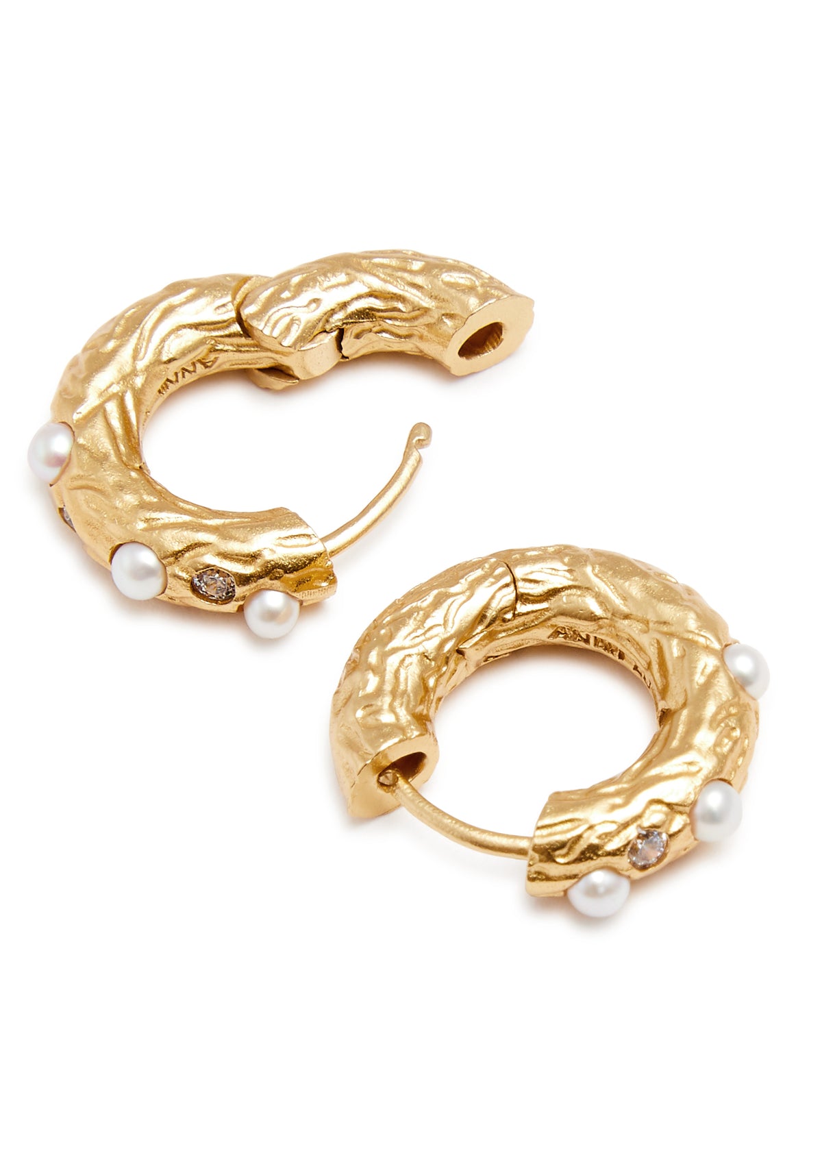These Gem In A Hoop 18kt Gold-Plated Hoop Earrings by Anni Lu offer a playful, textured design with crystal and pearl embellishments, perfect for adding a touch of glamour to any outfit. The 1.5 cm drop and textured hoop design make these earrings both versatile and statement-making, reflecting Anni Lu’s bohemian yet refined aesthetic. Wear them to elevate your everyday look or pair with other pieces to create an effortlessly chic style.