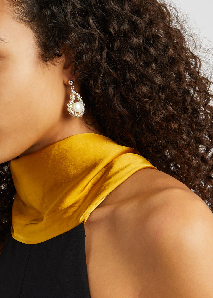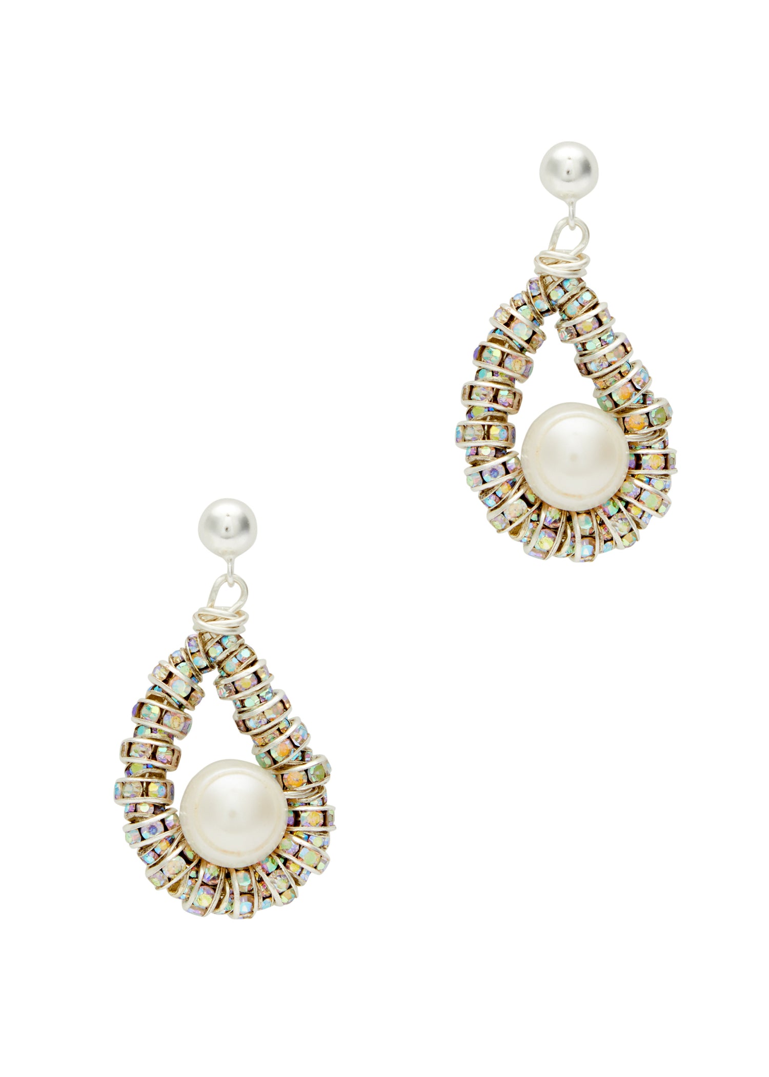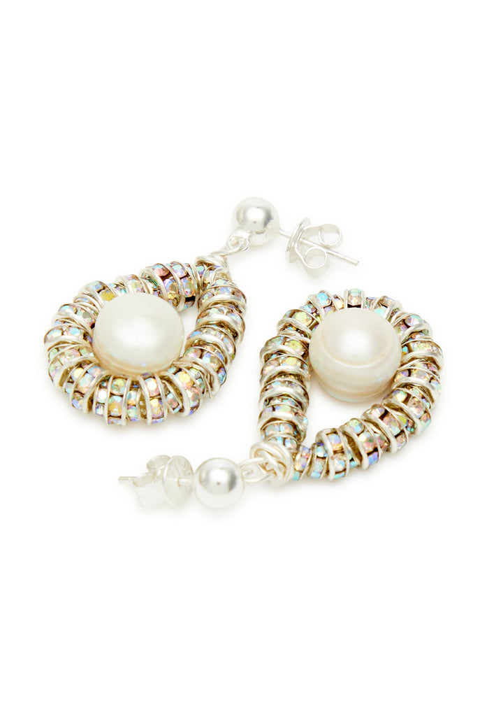 Handmade with your choice of gold-plating or sterling silver plating. Rondelle bead design with iridescent crystal embellishments and freshwater pearl detail. Drop: 4 cm. Butterfly fastening for pierced ears. Presented in a designer-stamped box. Due to the unique nature of each piece, this product may differ from the images shown.