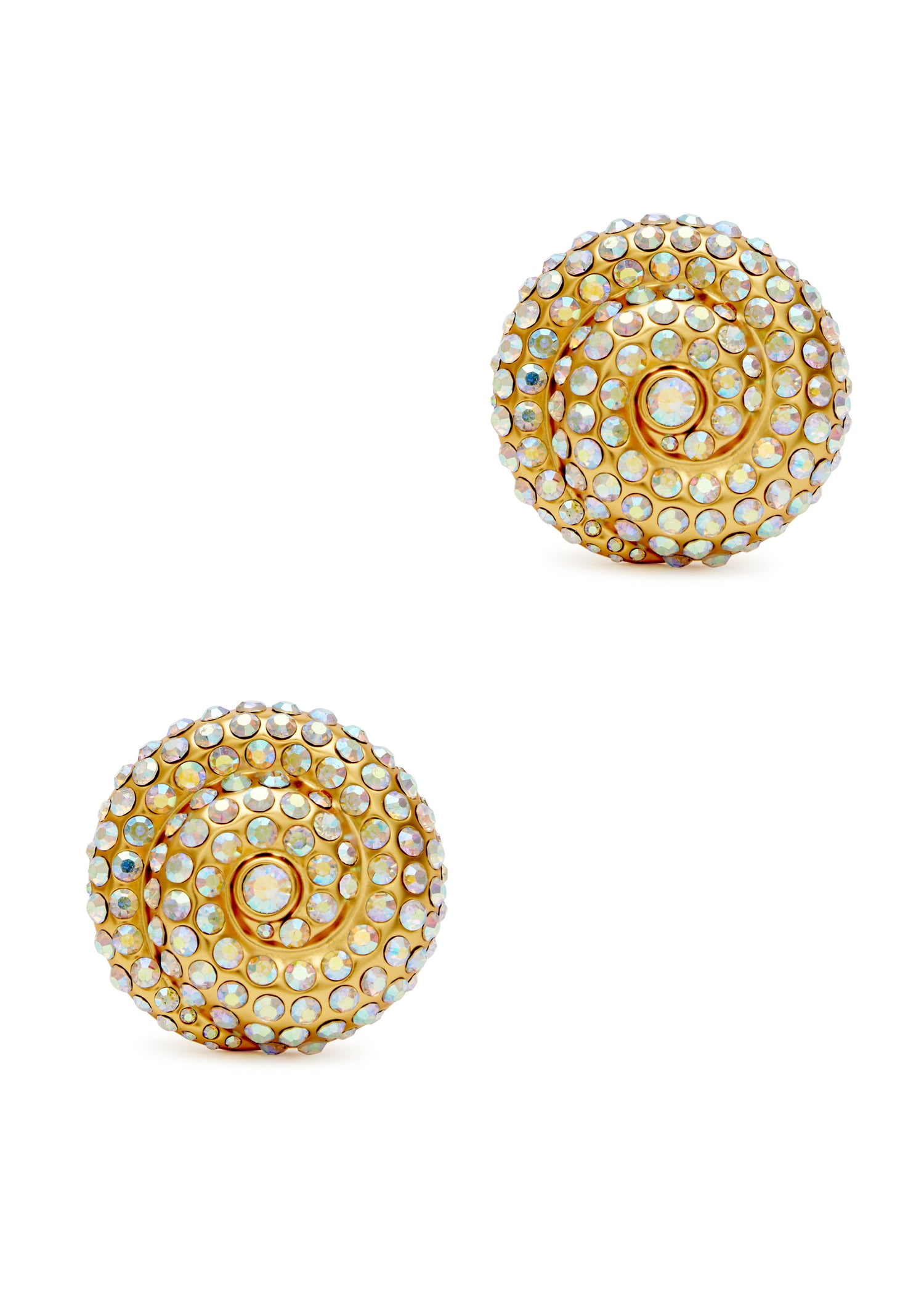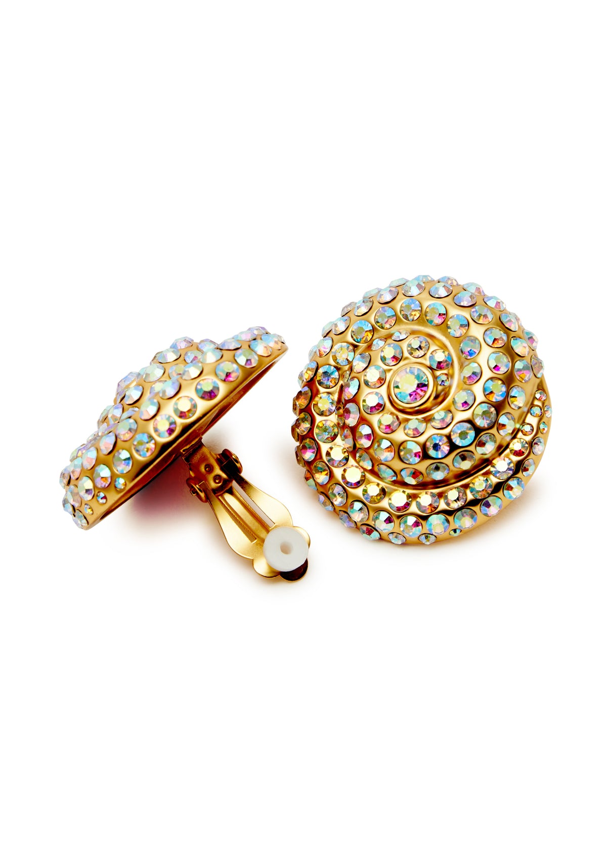 Handmade in 14kt gold-plated metal. Swirl shell design with iridescent crystal embellishments. Dimensions: 3.5 cm x 3.7 cm. Clip-on fastening for non-pierced ears. Presented in a designer-stamped box. Due to the unique nature of each piece, this product may differ from the images shown.