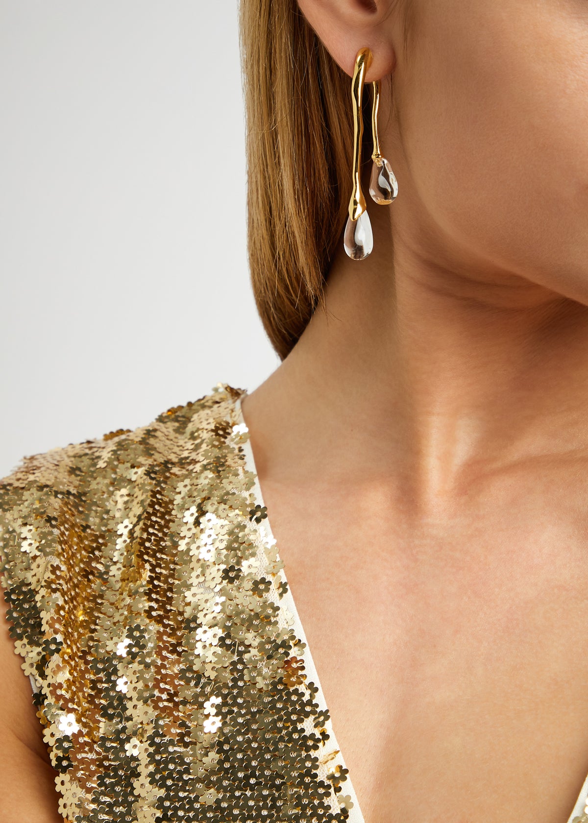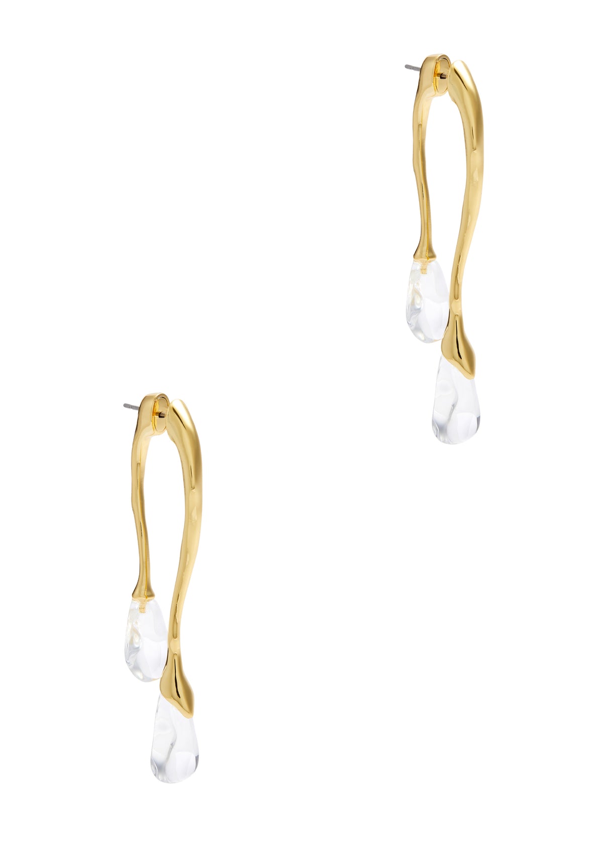 Hand-finished in 14kt gold-plated metal with sculpted design and Lucite detail. Drop: 1: 4.5 cm; 2: 6 cm. Post fastening for pierced ears. Presented in a designer-stamped pouch.