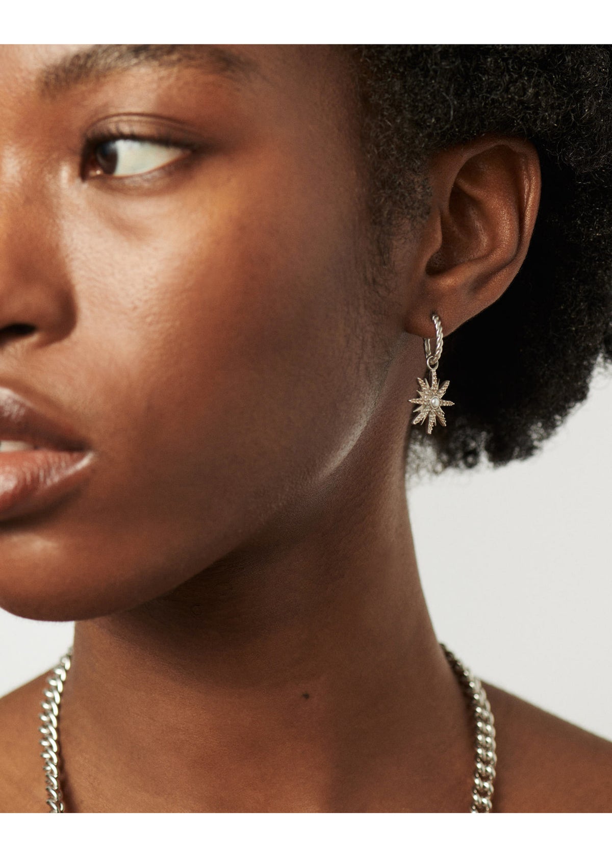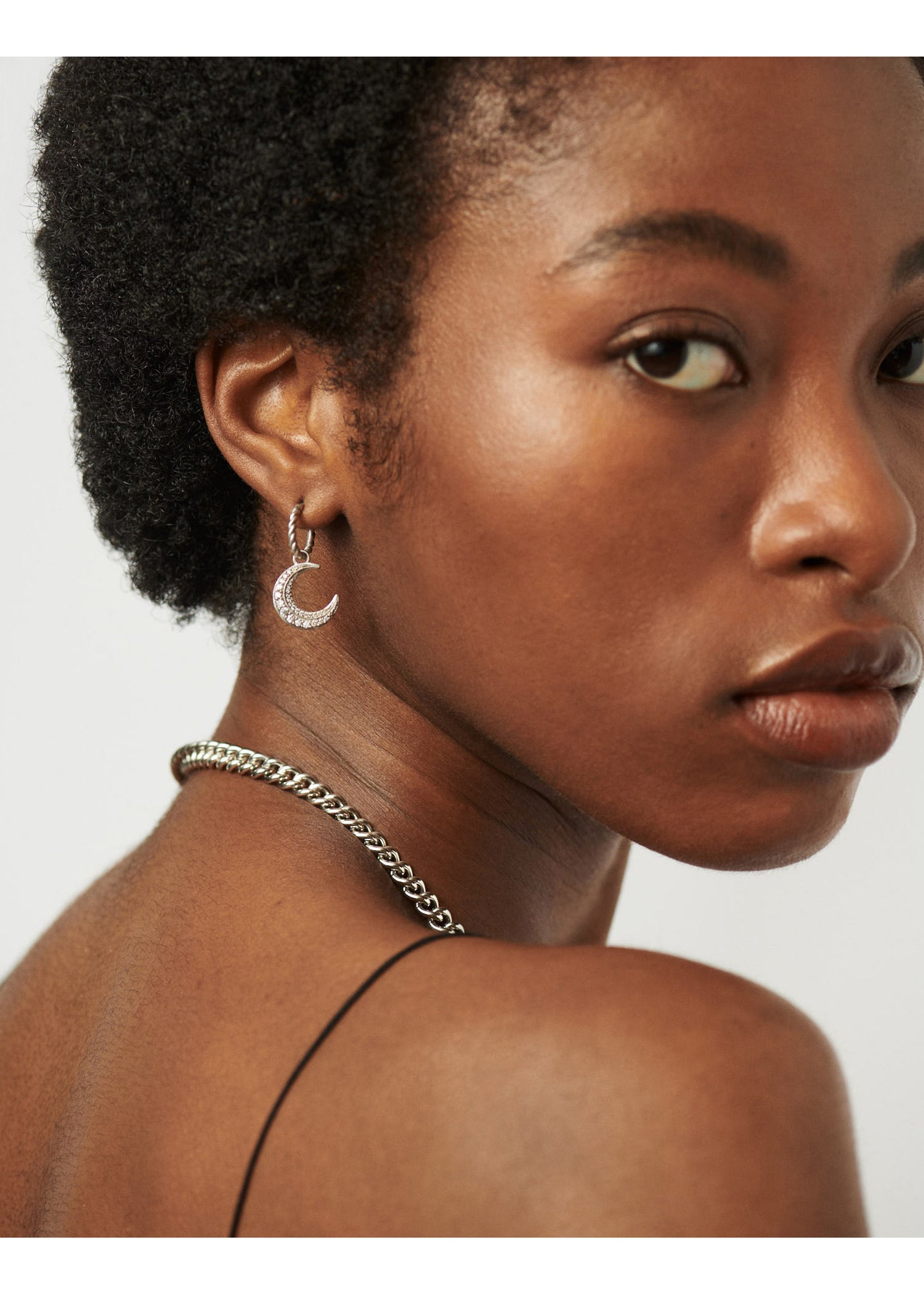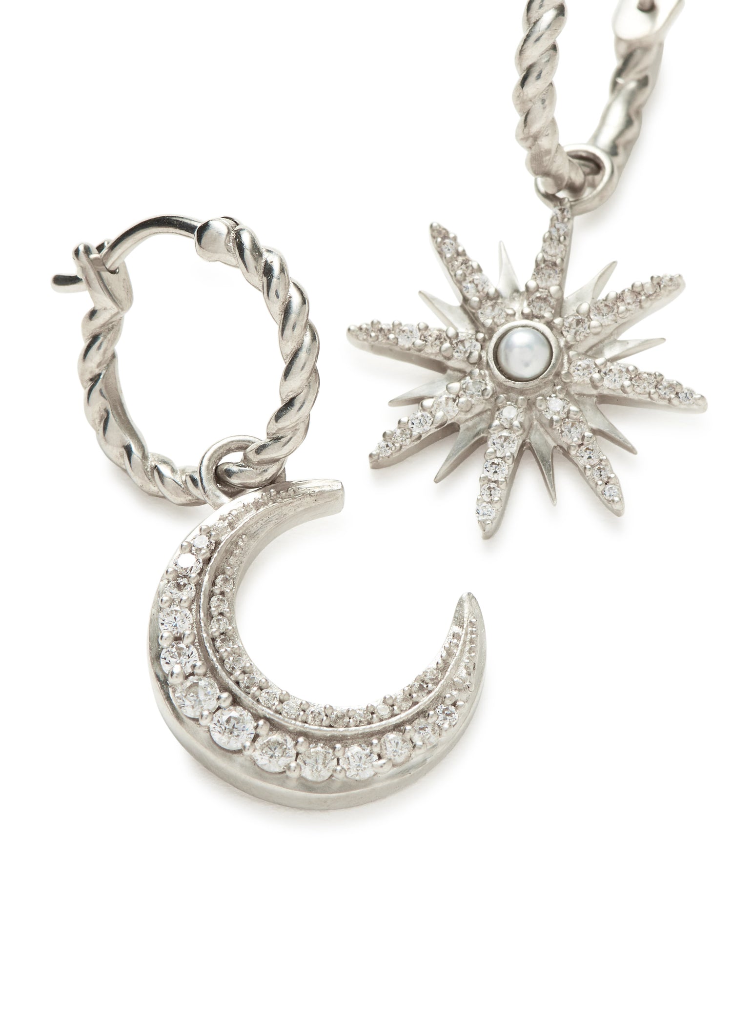 Hand-finished in silver-plated metal with twisted hoop design. Moon and star pendants with pearl cabochon and pavé crystal embellishments. Star dimensions: 1.6 cm, Moon dimensions: 1.5 cm. Sleeper fastening for pierced ears.