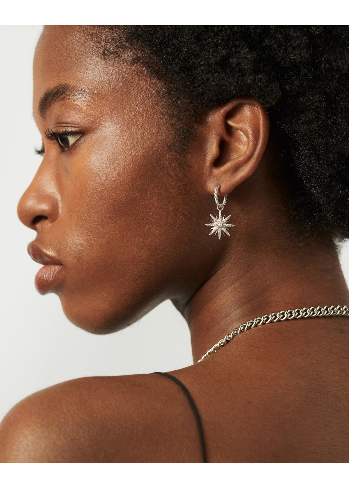 The X Harris Reed Moonlight Silver-Plated Hoop Earrings by Missoma offer an elegant and contemporary twist on the hoop design. Featuring twisted hoops with moon and star pendants, each adorned with pearl cabochons and pavé crystal embellishments, these earrings bring celestial charm to any look. With star and moon pendants measuring 1.6 cm and 1.5 cm, respectively, these earrings are the perfect blend of modern sophistication and artistic design.