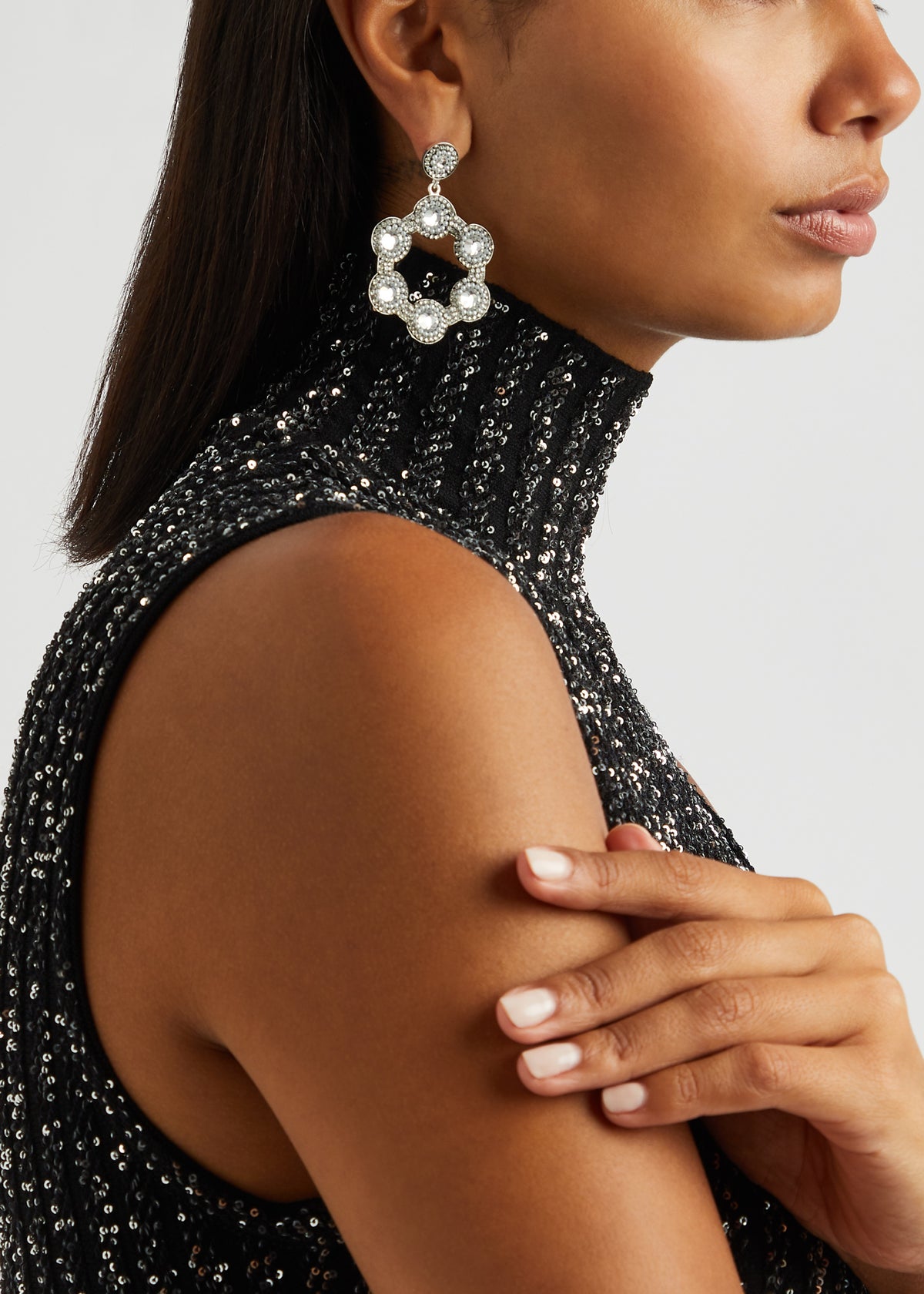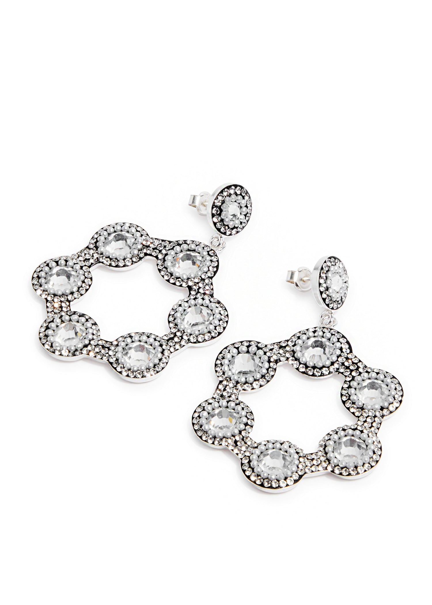 The Mini Crystal-Embellished Silver Hoop Earrings by Soru Jewellery combine bohemian luxury with modern flair. These handcrafted earrings are adorned with baroque pearls and sparkling crystals, creating an eye-catching design perfect for adding a touch of glamour to any look.