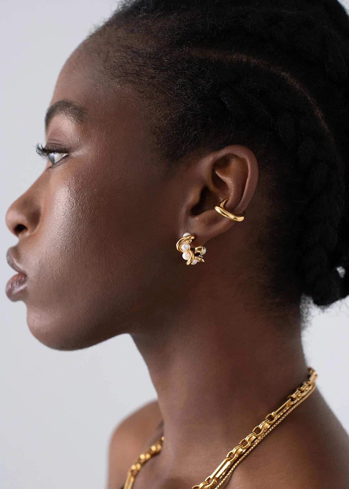 These Molten Mini Pearl and 18kt Gold-Plated Hoop Earrings by Missoma are an elegant blend of modern design and classic beauty. The twisted gold-plated brass hoops are adorned with delicate freshwater pearl embellishments, offering a refined, feminine touch. Perfect for layering or wearing solo, these earrings are an effortlessly stylish accessory for any occasion.