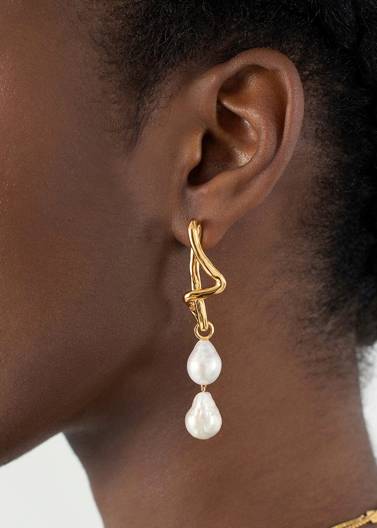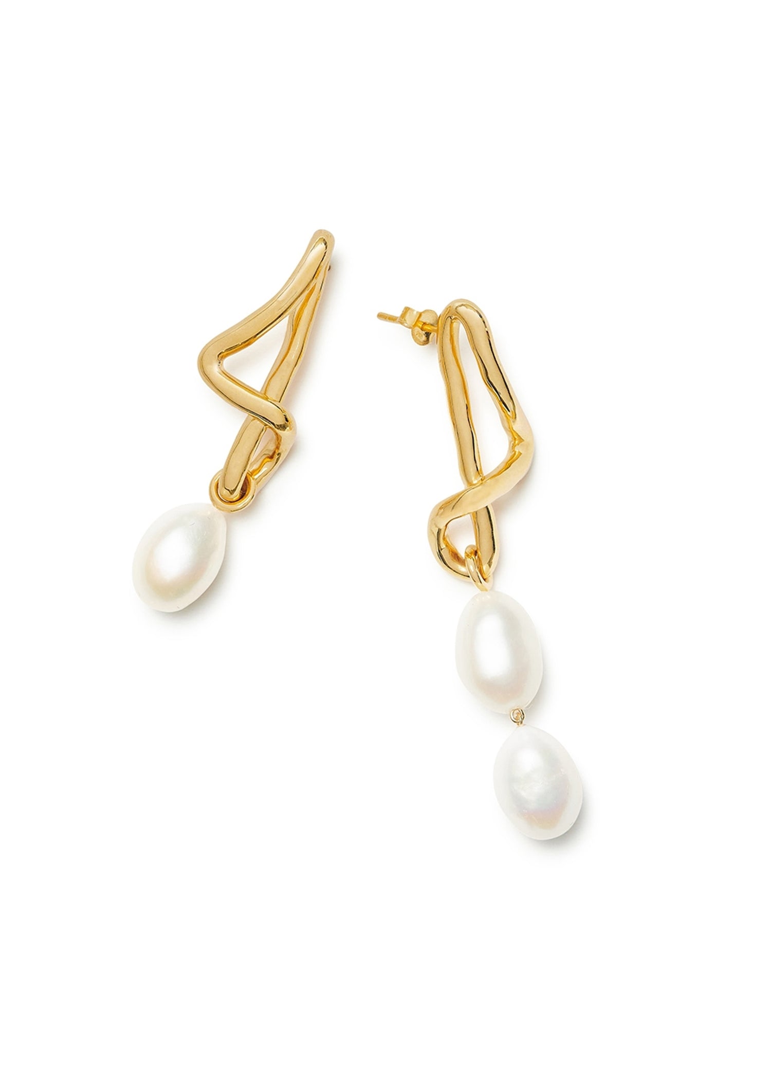 Crafted in 18kt gold-plated brass with asymmetric twisted design and freshwater baroque pearl charms. Post fastening for pierced ears.