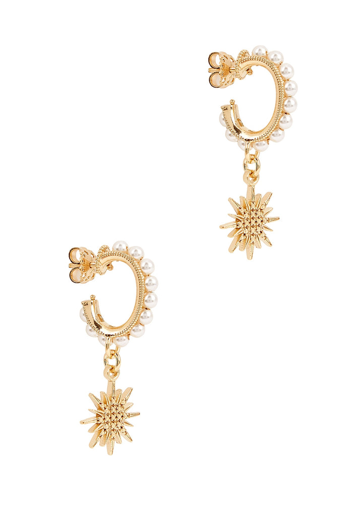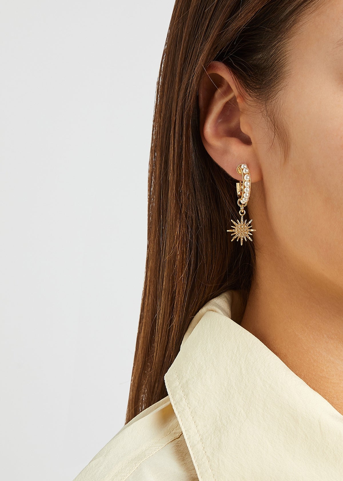 Handmade 24kt gold-plated silver hoop earrings. Swarovski pearl embellishments. Engraved moon charm. Butterfly fastening for pierced ears. Presented in a designer-stamped box. Hoop drop: 2cm. Charm dimensions: 1.5cm x 1.5cm.