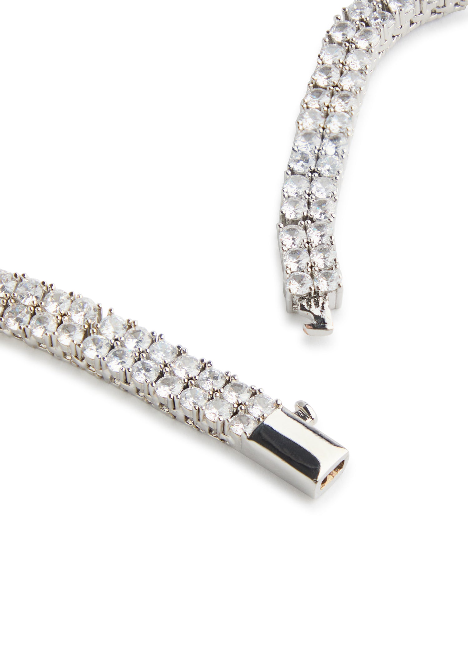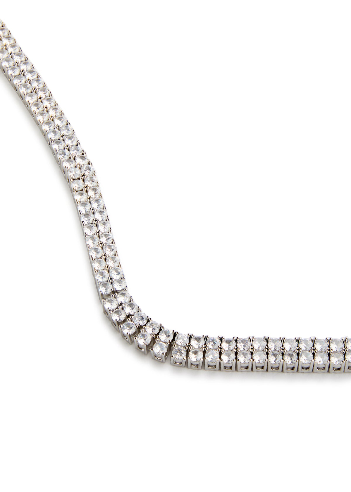 This necklace is crafted from rhodium-plated metal and features cubic zirconia crystal embellishments. It has a clasp fastening, a length of 35cm, and a width of 0.7cm.