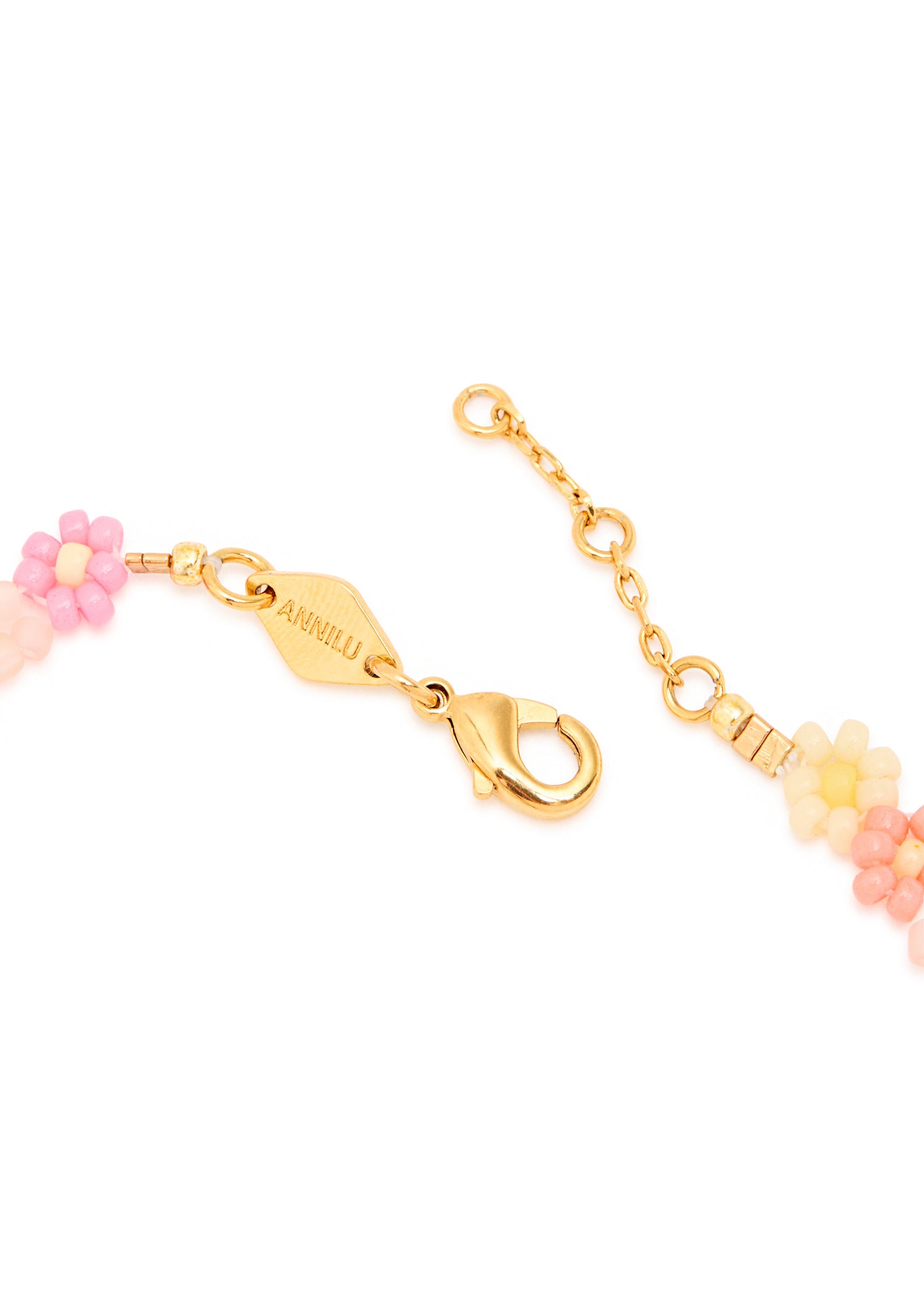 This Blossom 18kt gold-plated beaded bracelet by Anni Lu is a beautiful, floral-inspired piece that brings a sense of joyful, spring-like energy to your wrist. The delicate gold-plated chain is adorned with charming floral glass beads, creating a whimsical and feminine look. This bracelet is perfect for adding a touch of nature's beauty and gentle color to your style.