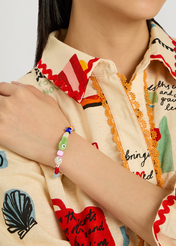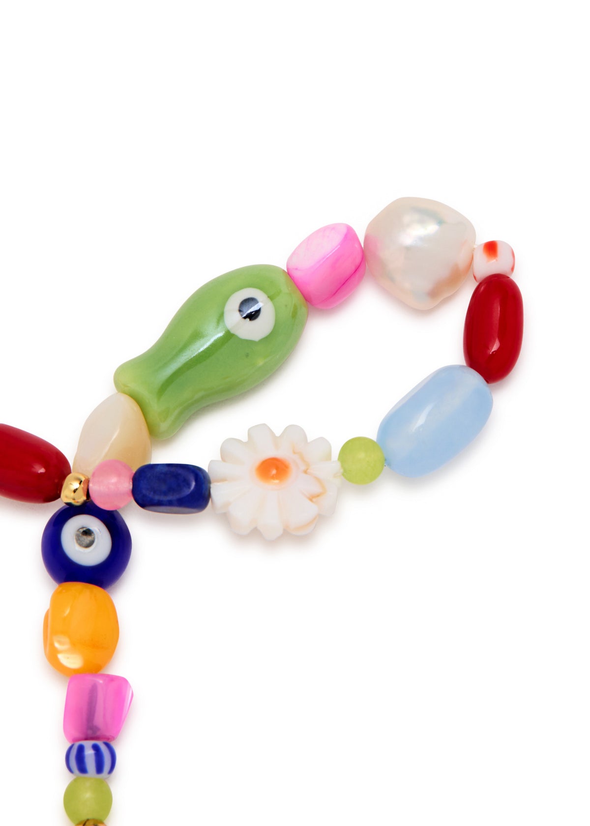 This Happy beaded 18kt gold-plated bracelet by Anni Lu is a celebration of pure joy and colorful charm. The vibrant mix of glass beads, whimsical floral and fish beads, and luminous freshwater pearls creates a playful and eclectic aesthetic. This bracelet is a perfect expression of personality and happiness, ideal for adding a touch of carefree style.