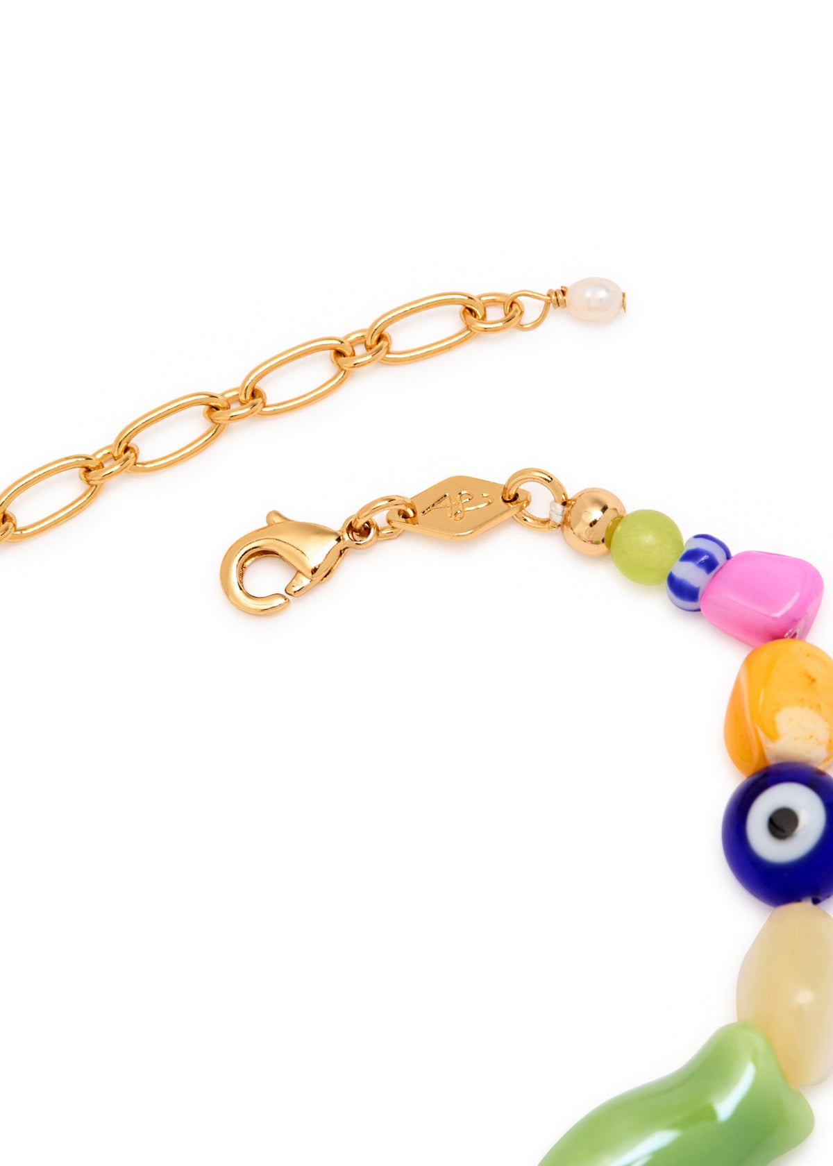 This bracelet is handmade from 18kt gold-plated brass and features a variety of beads including glass, floral, fish, freshwater pearls, lazurite, and jade. It has an adjustable lobster-clasp fastening and a length of 20.5cm.