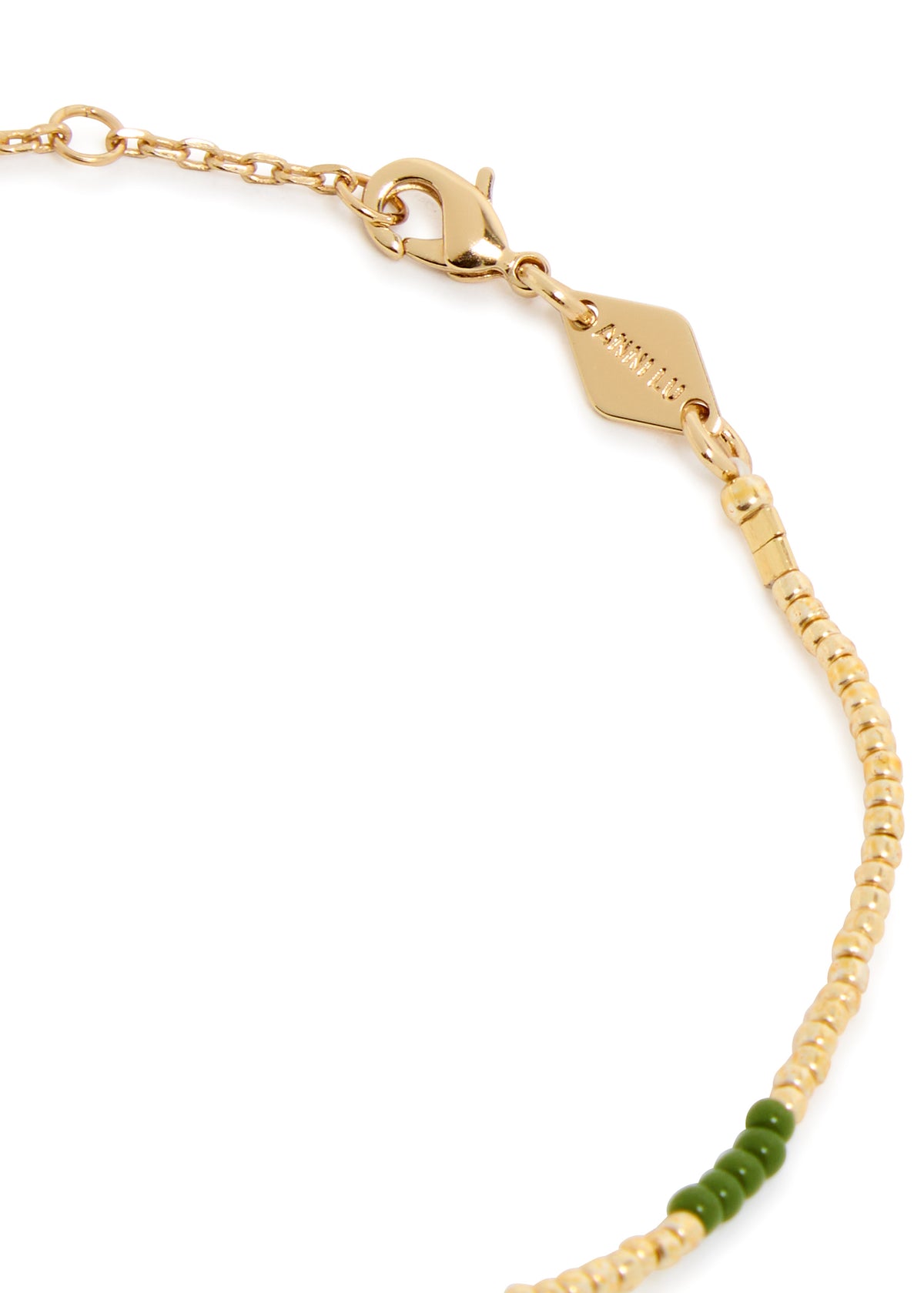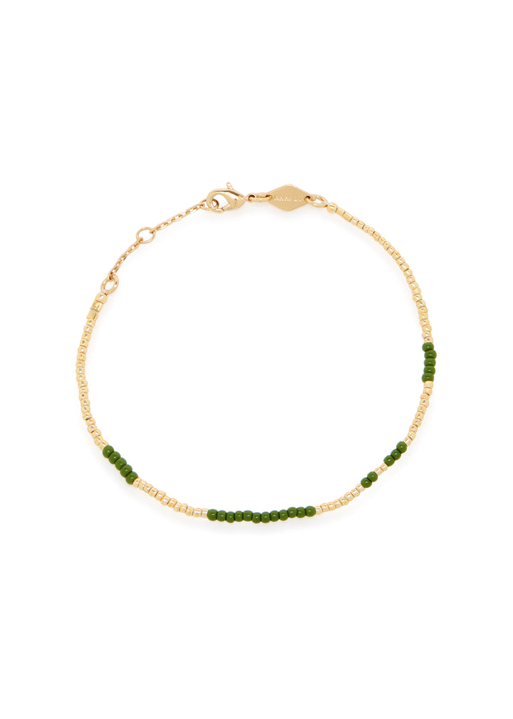 This Asym beaded bracelet by Anni Lu is a striking example of modern, artistic design. The asymmetrical placement of the gold-plated hardware among the beads creates a unique and dynamic look. This bracelet is perfect for the individual who values unconventional style and wants a piece that is both playful and sophisticated.