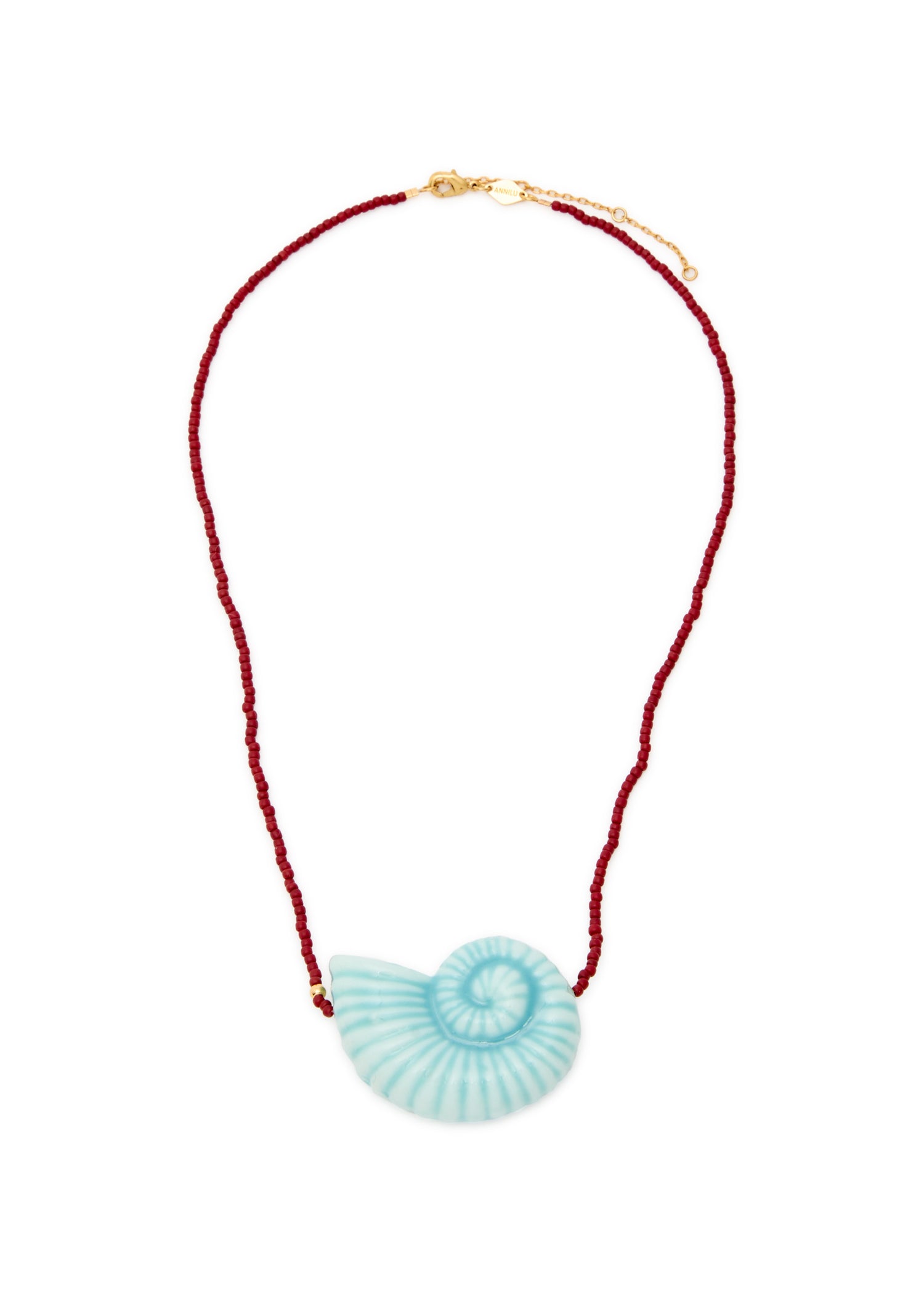 This Nautilus beaded 18kt gold-plated necklace by Anni Lu is a delightful and coastal-inspired piece. The vibrant beads, complemented by a charming resin shell charm, evoke the beauty of the sea. This necklace is perfect for adding a touch of summer whimsy and playful sophistication to any neckline.