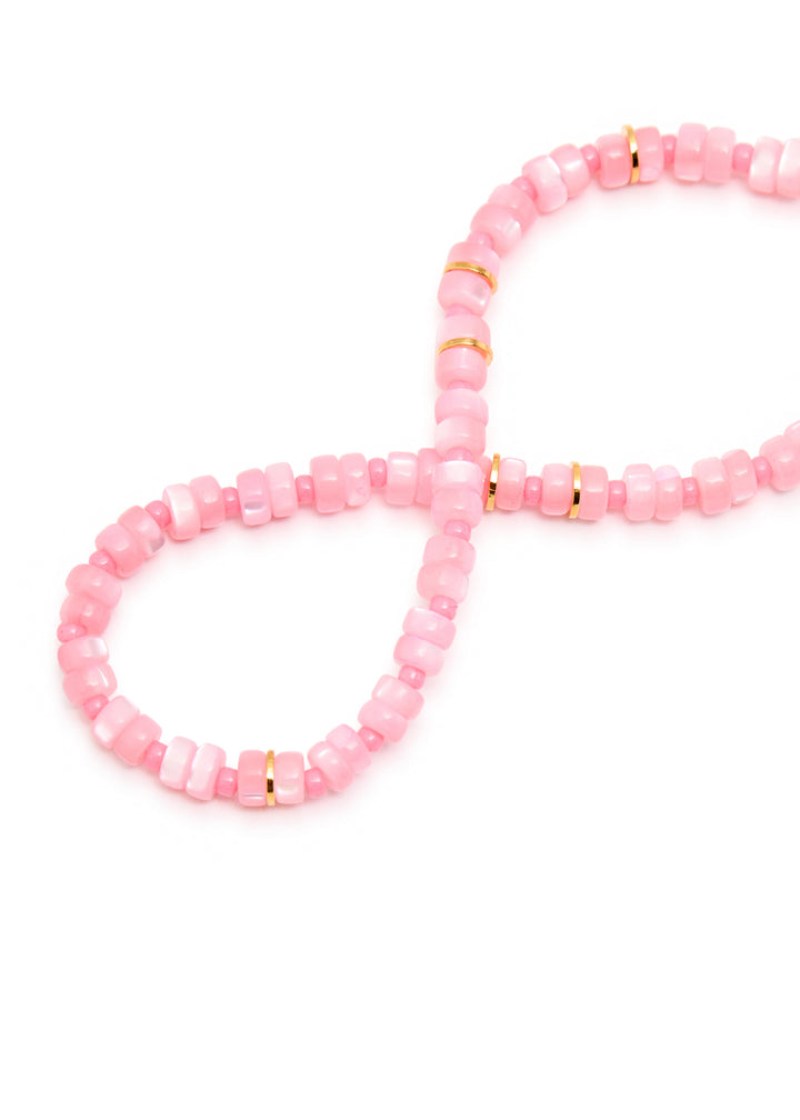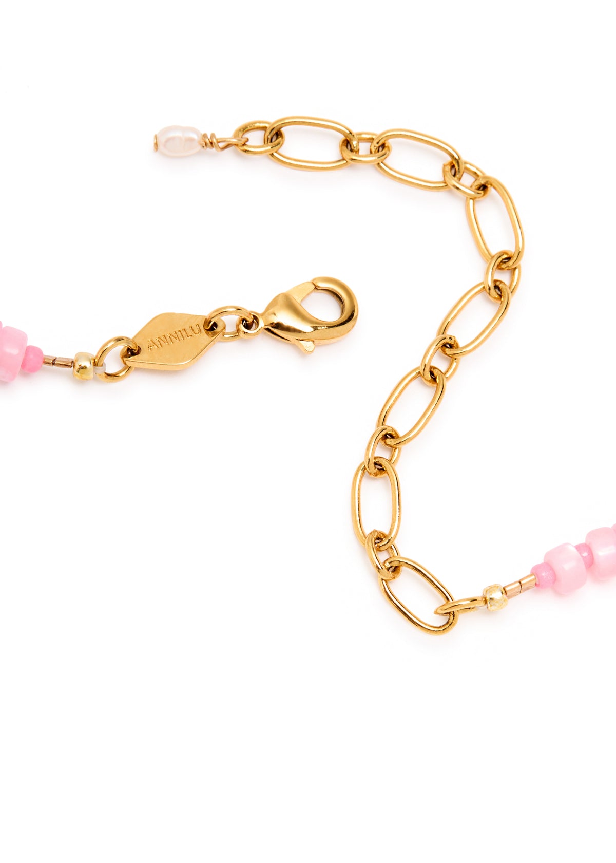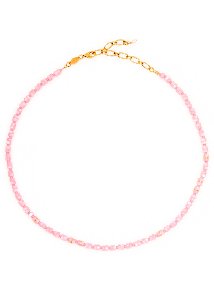 This Calypso beaded 18kt gold-plated necklace by Anni Lu is a vibrant and enchanting piece. The rich pink glass beads, interspersed with a luminous freshwater pearl, create a soft yet captivating color story. This necklace is perfect for adding a touch of feminine charm and a sense of carefree elegance to any outfit.